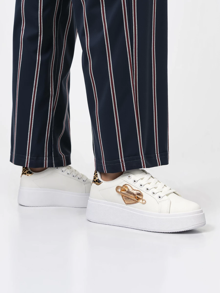 Damskie Sneakersy MIA LEOPARD to połączenie wyrazistego, cętkowanego motywu z uniwersalną formą miejskiego obuwia. Cholewka wykonana z ekoskóry w leopardowym wzorze przyciąga uwagę i nadaje stylizacji oryginalności. Złota ozdoba na boku stanowi subtelny, a zarazem elegancki akcent. Dzięki sznurowanemu zapięciu buty doskonale dopasowują się do stopy, a płaska, gumowa podeszwa zapewnia wygodę przez cały dzień.
