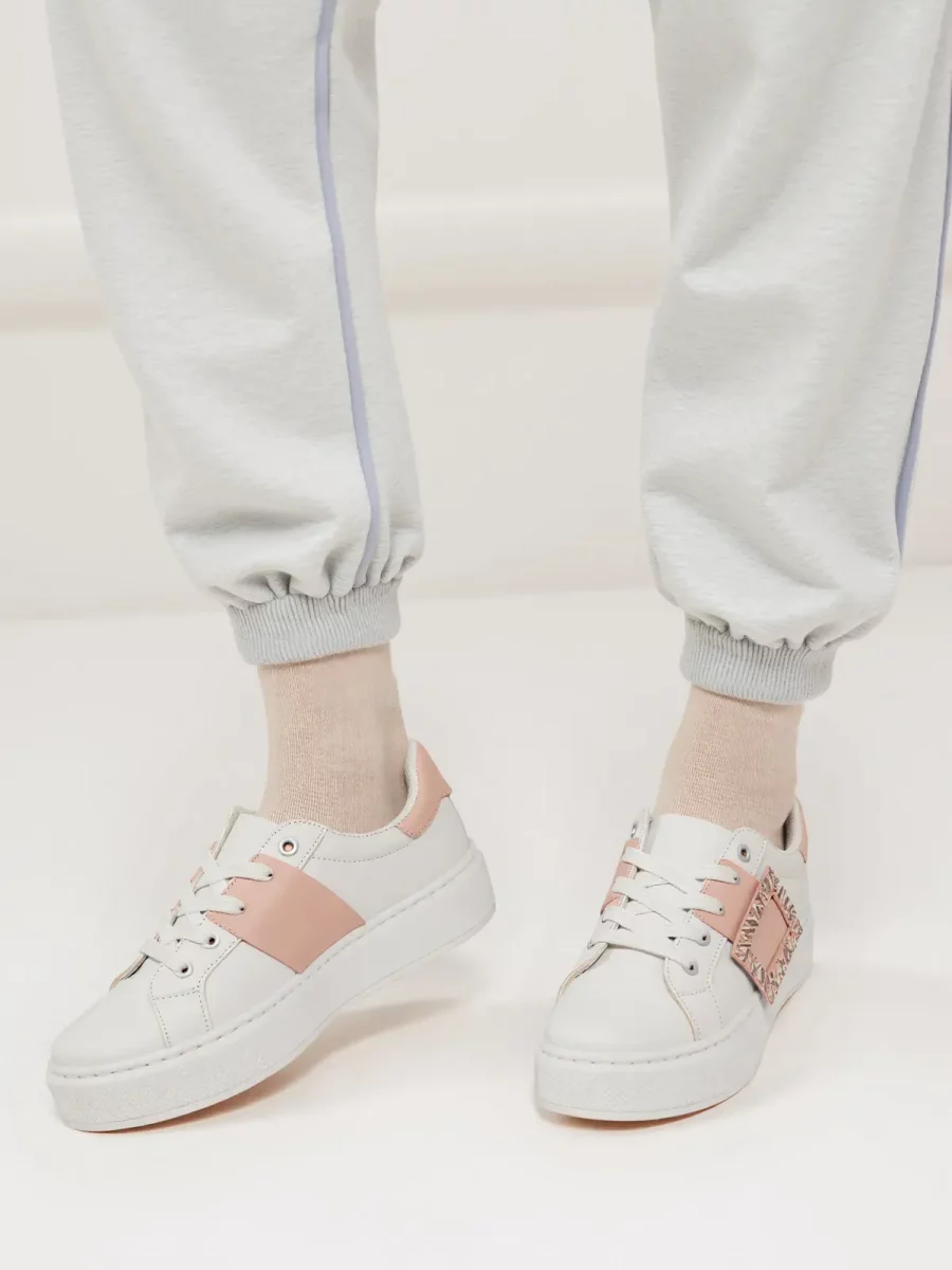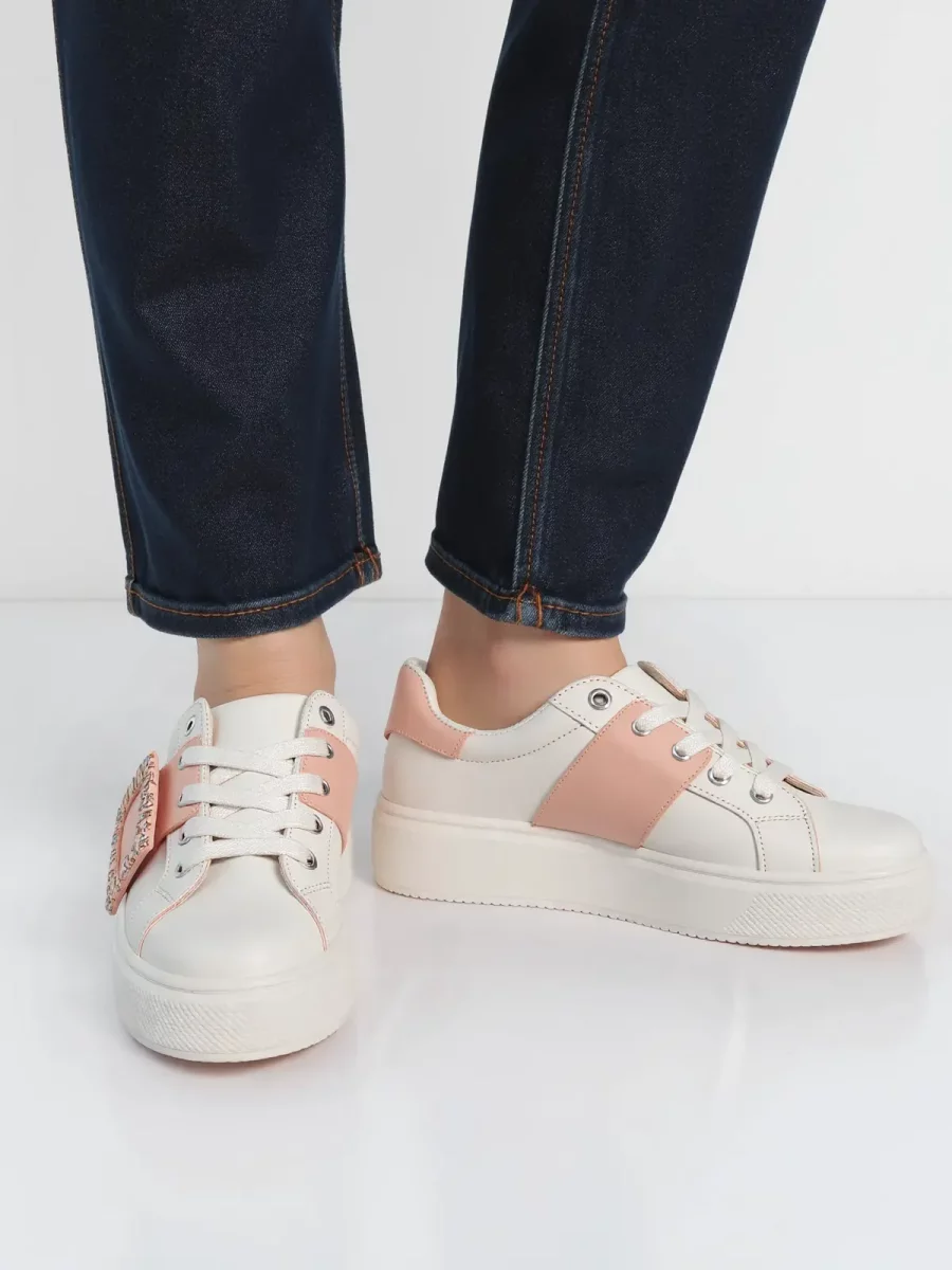MIRELLE PINK to wyjątkowe sneakersy, które łączą sportowy styl z eleganckimi detalami. Ich biała cholewka z delikatnym różowym akcentem i ozdobnymi perełkami sprawia, że są idealnym wyborem dla kobiet ceniących subtelne, ale efektowne dodatki w swojej garderobie. Doskonałe na co dzień, zapewniają komfort i modny wygląd.