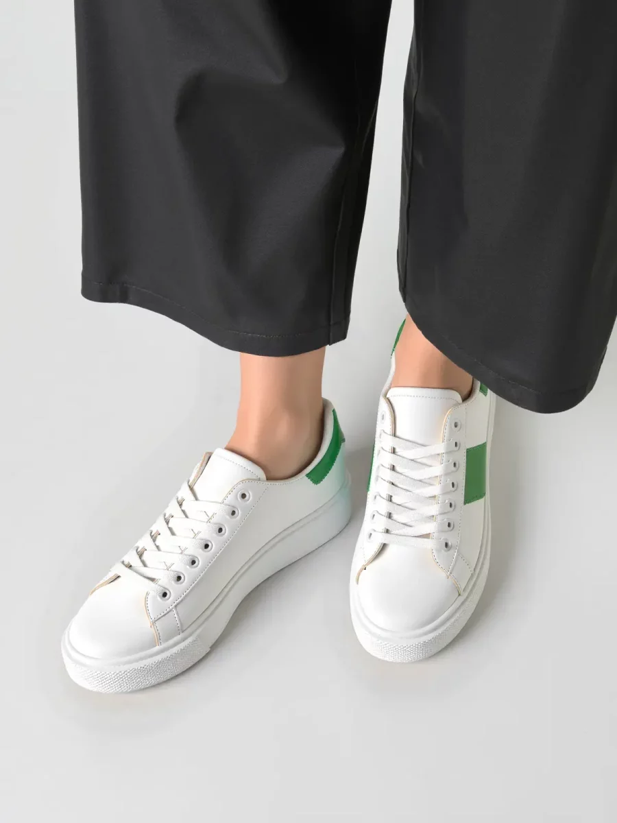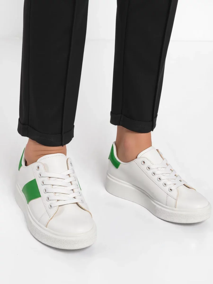 MONDAY GREEN to stylowe i wygodne sneakersy w białej kolorystyce z zielonym akcentem na bokach. Klasyczny design i subtelne detale sprawiają, że świetnie komponują się zarówno z codziennymi, jak i sportowymi stylizacjami. Wykonane z trwałych materiałów, zapewniają komfort noszenia przez cały dzień.