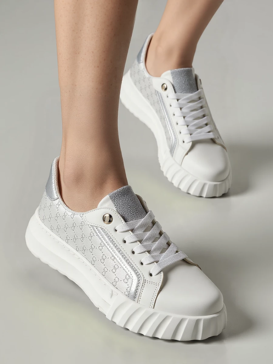 Damskie sneakersy MONVIA WHITE to połączenie klasyki i nowoczesnego designu. Wykonane z wysokiej jakości skóry ekologicznej, wyróżniają się eleganckimi, kontrastowymi panelami bocznymi z subtelnym wzorem. Metaliczne srebrne detale na języku i pięcie dodają im unikalnego, stylowego wyglądu. Gruba, biała podeszwa o karbowanym wykończeniu nie tylko podkreśla modny charakter butów, ale także zapewnia doskonałą amortyzację i wygodę noszenia. To idealny wybór dla kobiet ceniących casualową elegancję z nutą nowoczesności.