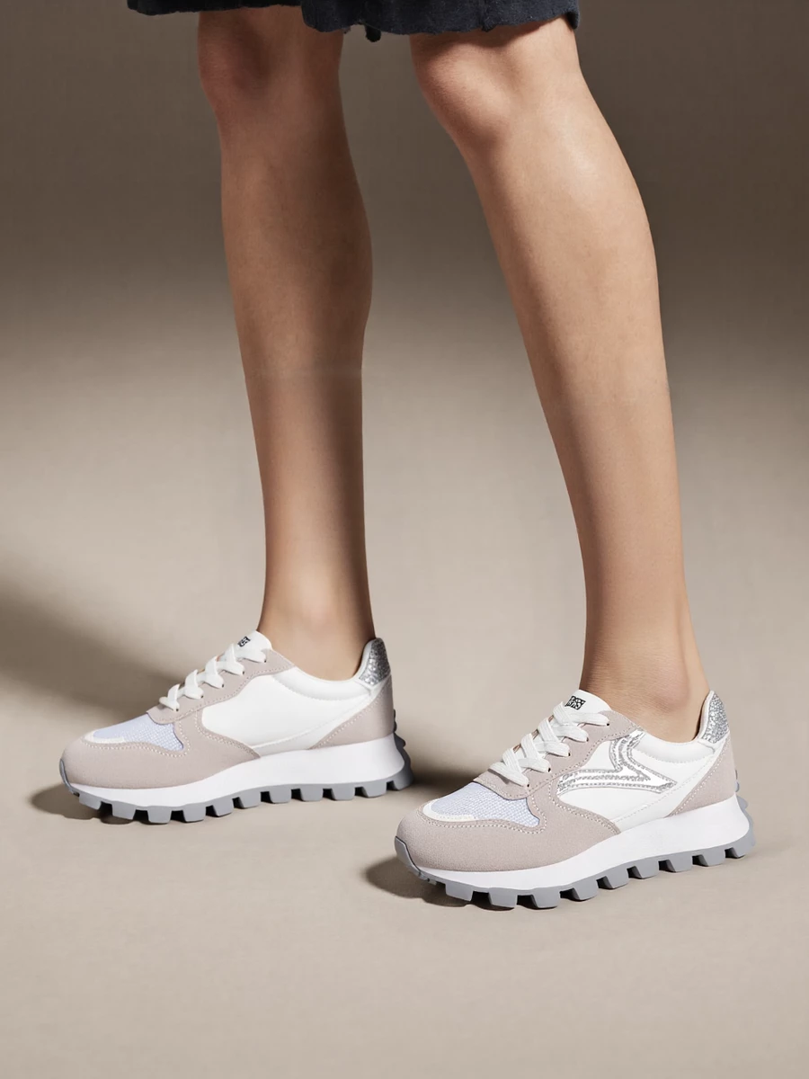 Damskie Sneakersy RAYA WHITE to harmonijne połączenie pastelowego beżu, bieli i połyskującego srebra. Cholewka z miękkiego zamszu ekologicznego, siateczki i metalicznych wstawek nie tylko zachwyca designem, ale także gwarantuje komfort i lekkość. Gruba, ząbkowana podeszwa w szarym kolorze zapewnia odpowiednią przyczepność i modny, masywny look. Idealne do miejskich stylizacji i codziennego noszenia.