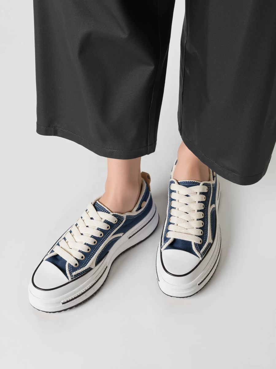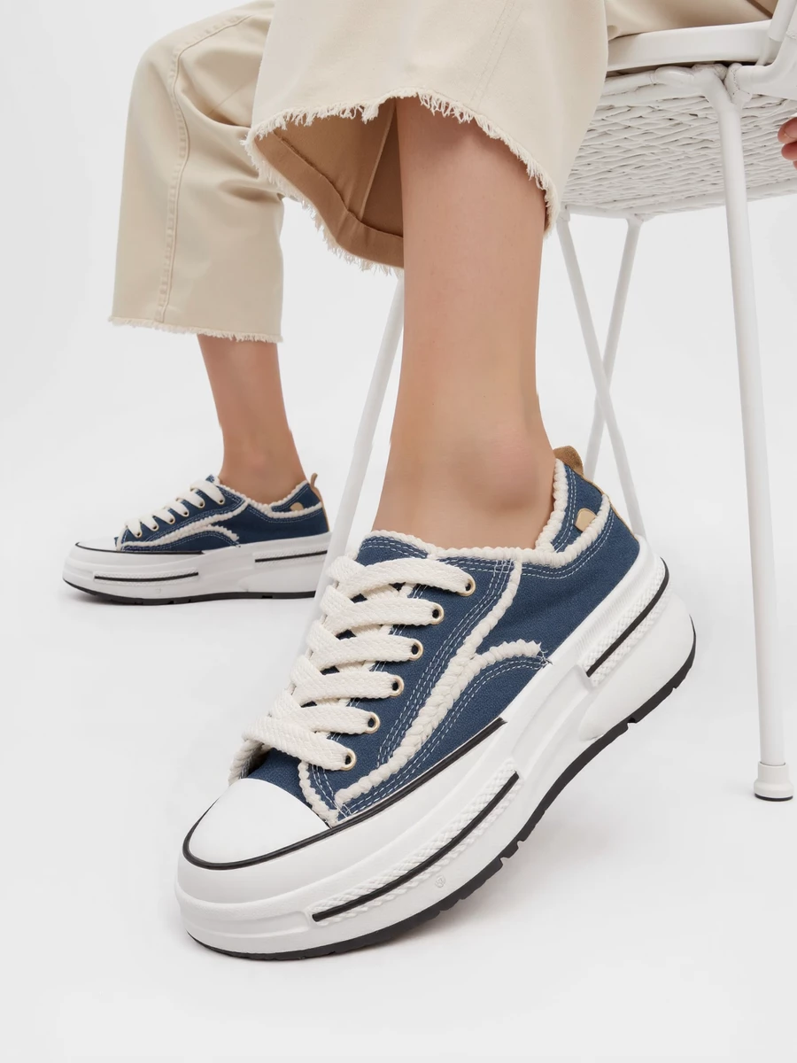 ROGUE Denim Blue to modne sneakersy w stylu vintage, wykonane z postrzępionego jeansu. Ich unikalny design nawiązuje do miejskiego streetwearu, a masywna podeszwa zapewnia wygodę i stabilność przez cały dzień. To idealne połączenie luzu i stylowego wyglądu!