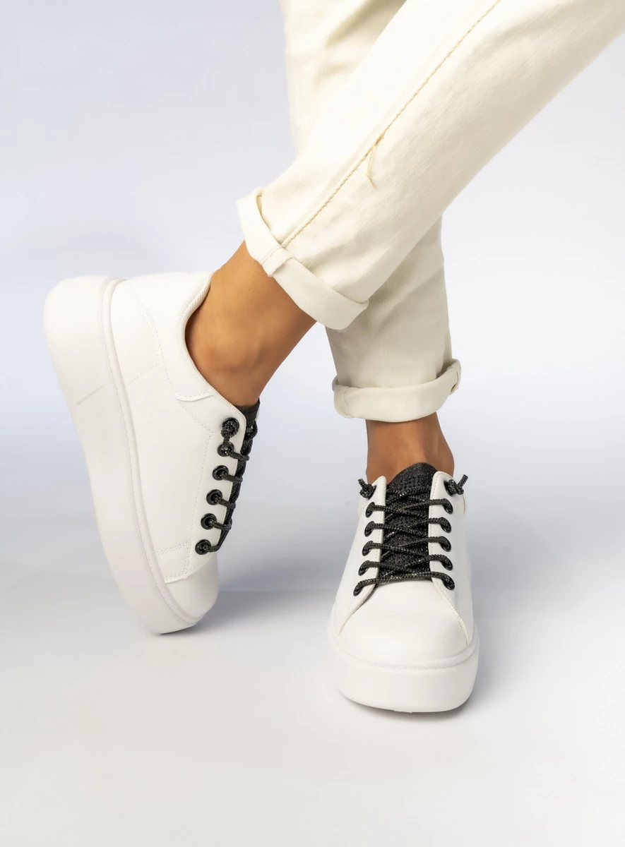 SAVANNAH WHITE/BLACK to modne sneakersy na wysokiej platformie, które doskonale łączą klasyczną biel z wyrazistymi czarnymi detalami. Elegancki design z kontrastowym językiem oraz dekoracyjnymi sznurówkami nadaje im nowoczesnego i odważnego charakteru. Świetnie sprawdzą się zarówno w codziennych, jak i bardziej streetwearowych stylizacjach.