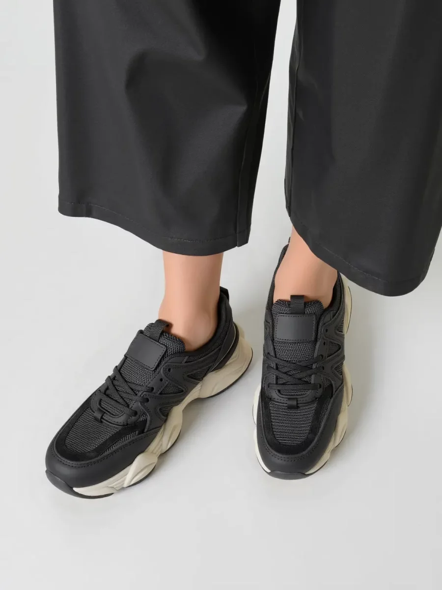 Damskie sneakersy SHADOW BLACK to stylowe buty o nowoczesnym designie, stworzone dla kobiet ceniących wygodę i modny wygląd. Cholewka wykonana z połączenia oddychającej siateczki i skóry ekologicznej, zapewnia trwałość oraz komfort noszenia. Kontrastowa, gruba podeszwa w kolorze białym dodaje im charakteru, a solidna amortyzacja sprawia, że są idealnym wyborem na co dzień. Świetnie komponują się zarówno z casualowymi, jak i sportowymi stylizacjami.