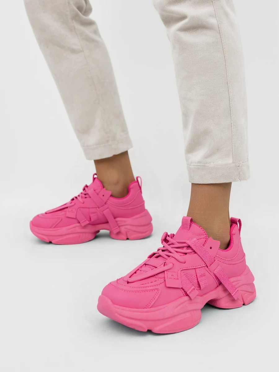 Sneakersy TITAN w kolorze fuksjowym (fuchsia) to odważna i stylowa propozycja dla osób, które pragną wyróżniać się w tłumie. Dzięki wyrazistej kolorystyce i nowoczesnemu designowi, buty te doskonale pasują do miejskich, casualowych stylizacji. Wykonane z wysokiej jakości materiałów syntetycznych, oferują wygodę, trwałość i komfort podczas całodziennego noszenia. Posiadają grubą, stabilną podeszwę oraz system sznurowania z dodatkowymi paskami, które zapewniają dodatkową stabilność.