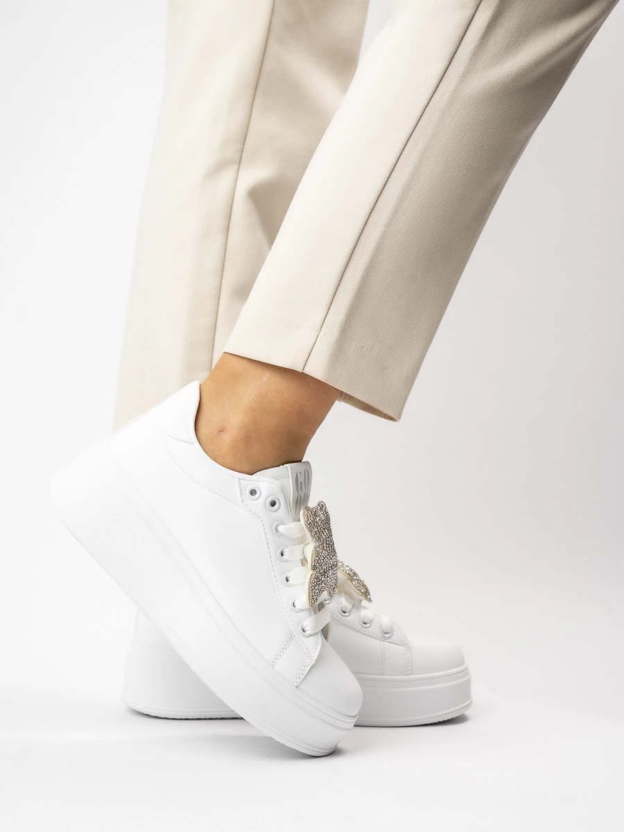 Damskie sneakersy VELARA ALL WHITE łączą klasykę z nowoczesnym stylem. W pełni białe, na solidnej platformie, doskonale podkreślają sylwetkę i dodają lekkości każdej stylizacji. Błyszcząca aplikacja w kształcie kokardy na sznurówkach nadaje im eleganckiego akcentu, czyniąc je idealnym wyborem dla kobiet ceniących modny wygląd i komfort.