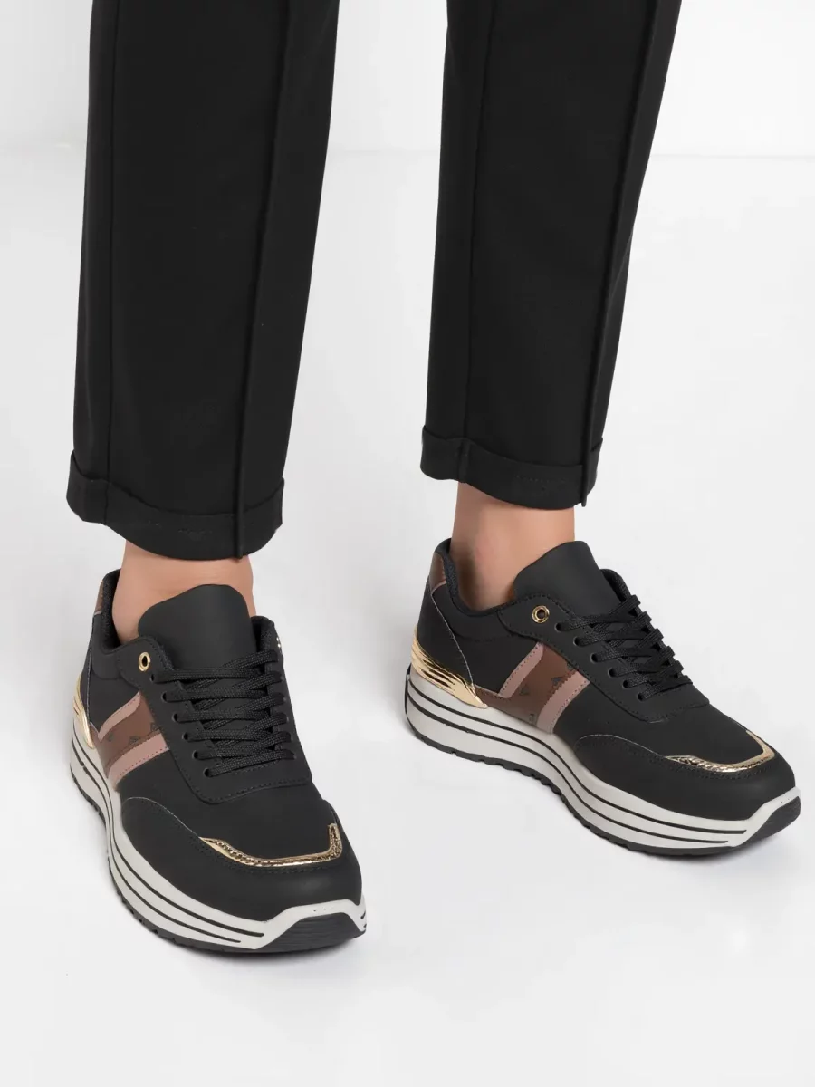 Stylowe damskie sneakersy VELOXA BLACK to połączenie elegancji i sportowego stylu. Wykonane z wysokiej jakości skóry ekologicznej i materiału tekstylnego, zapewniają komfort noszenia przez cały dzień. Subtelne złote detale i kontrastowa podeszwa dodają im wyjątkowego charakteru, idealnie komponując się z codziennymi stylizacjami.