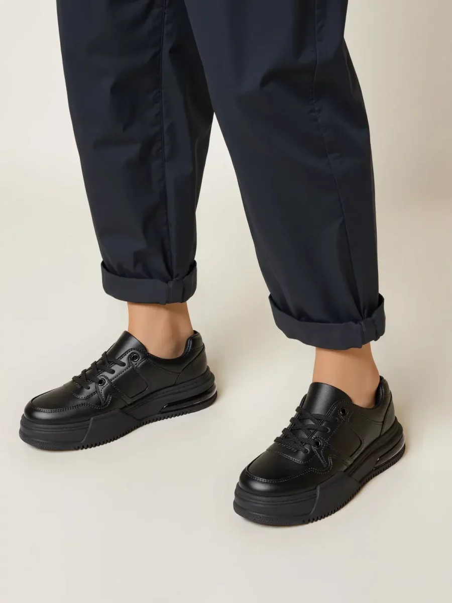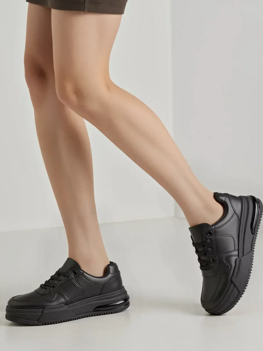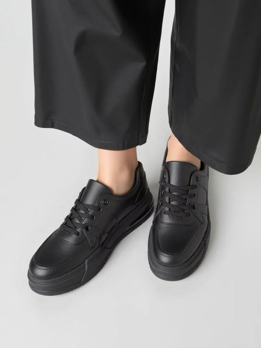 Damskie sneakersy VELVIA BLACK to klasyczna propozycja dla miłośniczek minimalistycznego stylu. Wykonane z gładkiej skóry ekologicznej, oferują elegancki wygląd z subtelnym akcentem w postaci detalu na pięcie. Sznurowane, z metalowymi oczkami, zapewniają wygodne dopasowanie. Uniwersalny design sprawia, że buty świetnie komponują się zarówno z casualowymi, jak i bardziej eleganckimi stylizacjami.