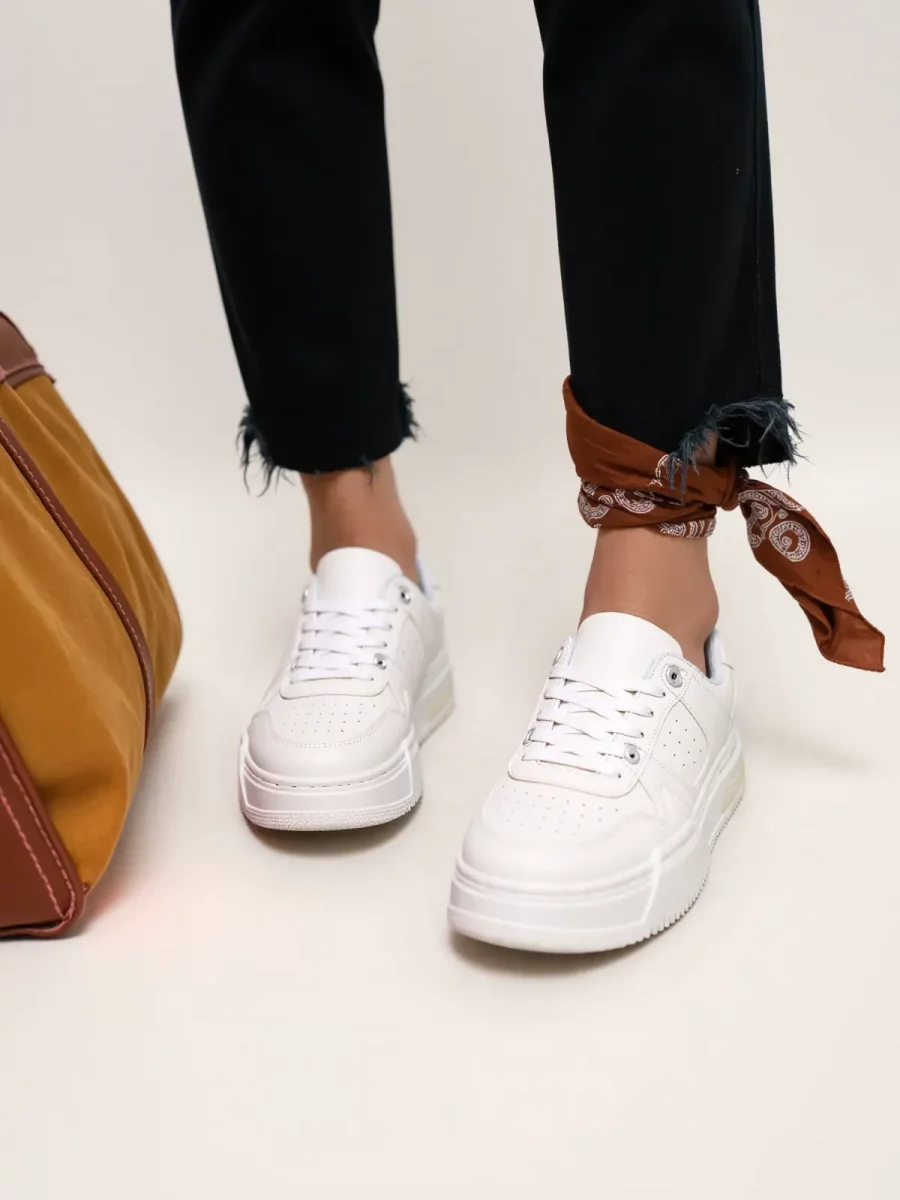 Damskie sneakersy VELVIA WHITE to klasyczna propozycja dla miłośniczek minimalistycznego stylu. Wykonane z gładkiej skóry ekologicznej, oferują elegancki wygląd z subtelnym akcentem w postaci detalu na pięcie. Sznurowane, z metalowymi oczkami, zapewniają wygodne dopasowanie. Uniwersalny design sprawia, że buty świetnie komponują się zarówno z casualowymi, jak i bardziej eleganckimi stylizacjami.