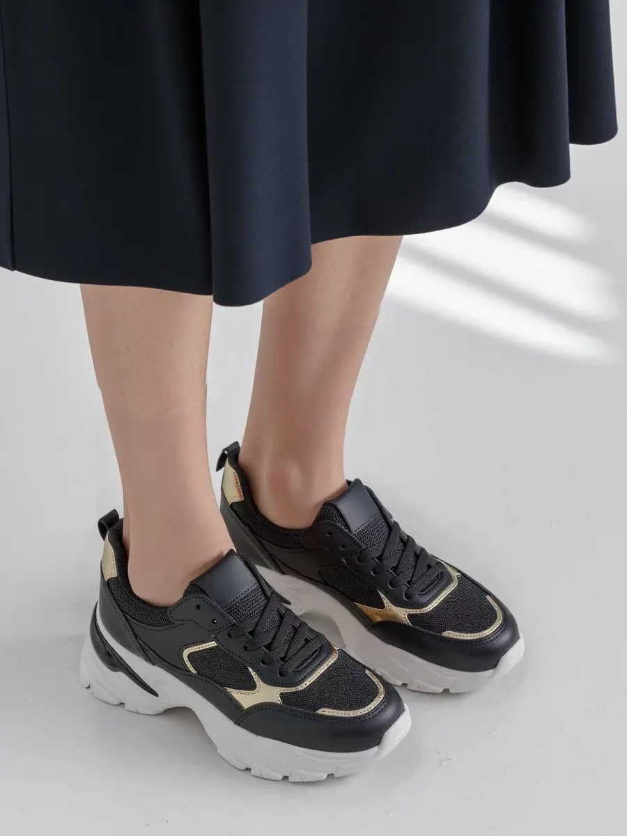 Damskie sneakersy VORTEX BLACK to połączenie sportowego komfortu z nowoczesnym designem. Cholewka wykonana z wysokiej jakości skóry ekologicznej, materiału tekstylnego i zamszowych wstawek, zapewnia trwałość oraz wygodę noszenia. Metaliczne srebrne akcenty dodają dynamicznego wyglądu, a masywna, amortyzująca podeszwa gwarantuje stabilność i komfort przy każdym kroku. Model idealny dla kobiet, które cenią styl i wygodę w codziennych stylizacjach.