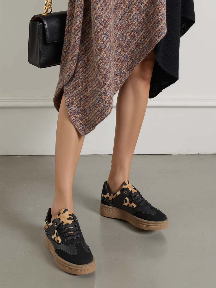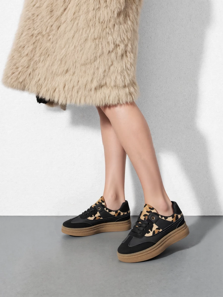 Sneakersy damskie w kolorze czarnym, wykonane z połączenia tworzywa sztucznego i materiału tekstylnego z imitacją futerka w zwierzęcy wzór. Model posiada gumową, jednolitą podeszwę w odcieniu brązu, która zapewnia wygodę i stabilność podczas chodzenia.