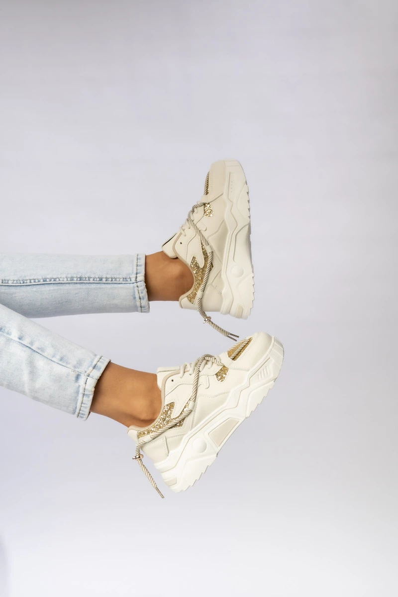 Sznurowane sneakersy – buty sportowe damskie. Najmodniejsza w tym sezonie. Doskonale komponuje się ze złotymi, błyszczącymi detalami, nadając wyjątkowego charakteru każdej stylizacji. Sneakersy wykonane z wysokiej jakości skóry ekologicznej i tkaniny gwarantują wygodę oraz doskonałe dopasowanie do stopy. Idealne zarówno na co dzień, jak i do modnych, streetwearowych outfitów.