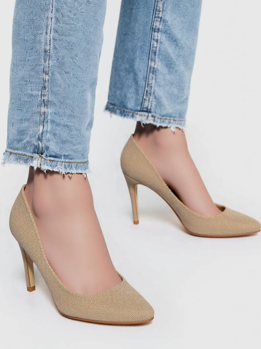 Szpilki ASTRINA GOLD to ponadczasowy model, który łączy klasyczny design z luksusowym, brokatowym wykończeniem. Ich złota powierzchnia subtelnie połyskuje, dodając każdej stylizacji wyjątkowego szyku. Smukły obcas i migdałowy nosek sprawiają, że optycznie wydłużają nogi, zapewniając jednocześnie komfort noszenia. Idealne na wesela, eleganckie przyjęcia i wyjątkowe okazje.