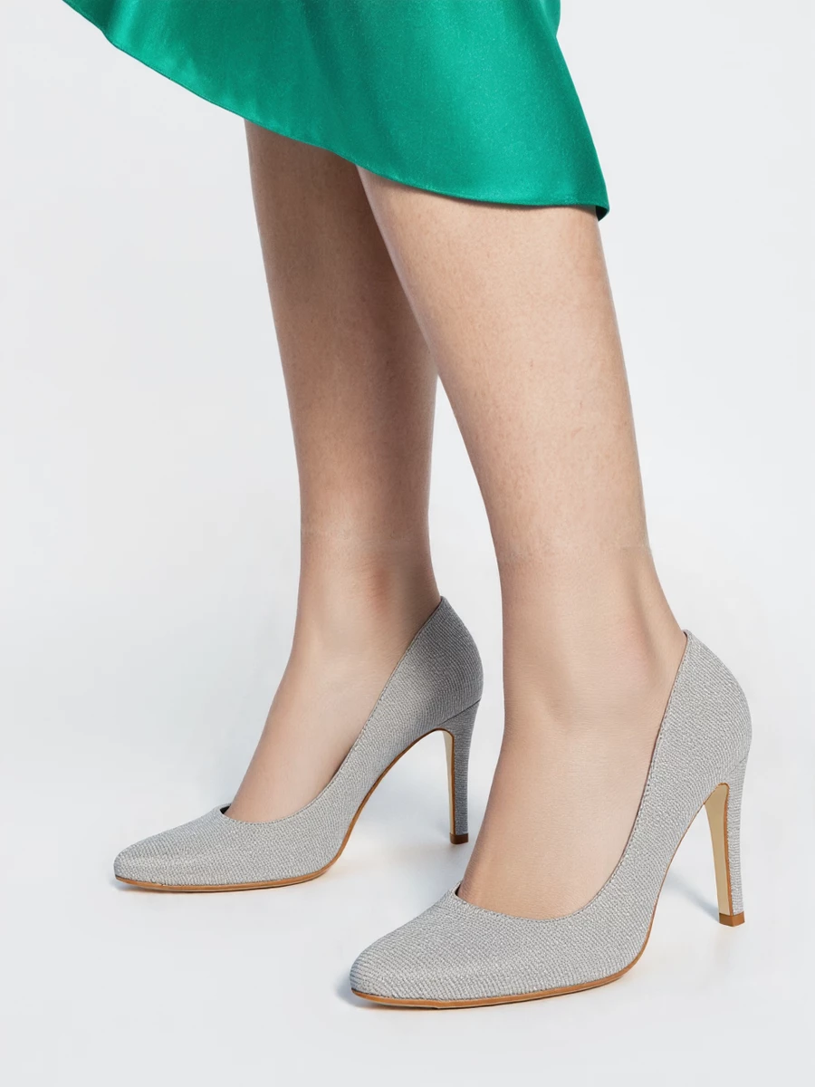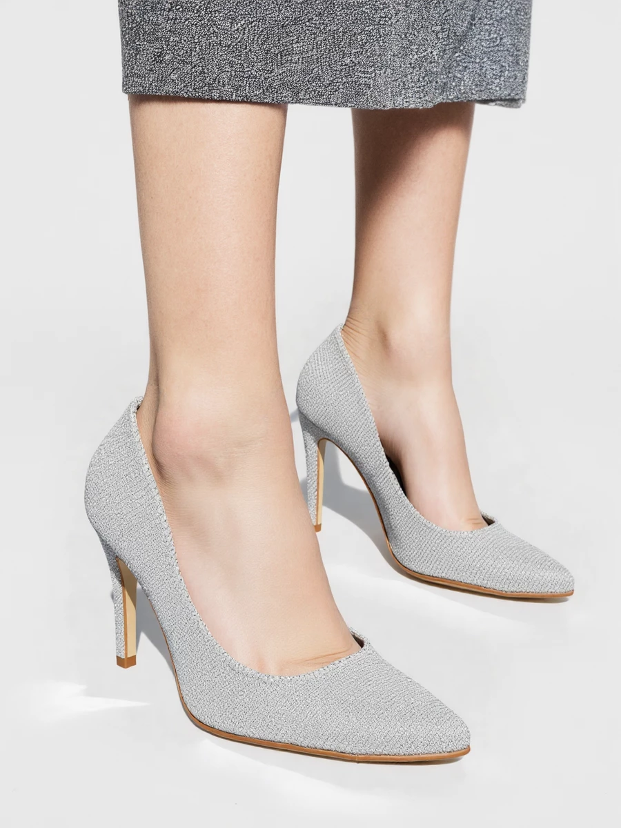 Szpilki ASTRINA SILVER to idealny wybór dla kobiet ceniących elegancję i subtelny blask. Ich srebrna, brokatowa powierzchnia nadaje stylizacji wyjątkowego charakteru, a smukły obcas i migdałowy nosek zapewniają optyczne wysmuklenie nóg. Doskonałe na wyjątkowe okazje, takie jak wesela, przyjęcia czy eleganckie wyjścia.