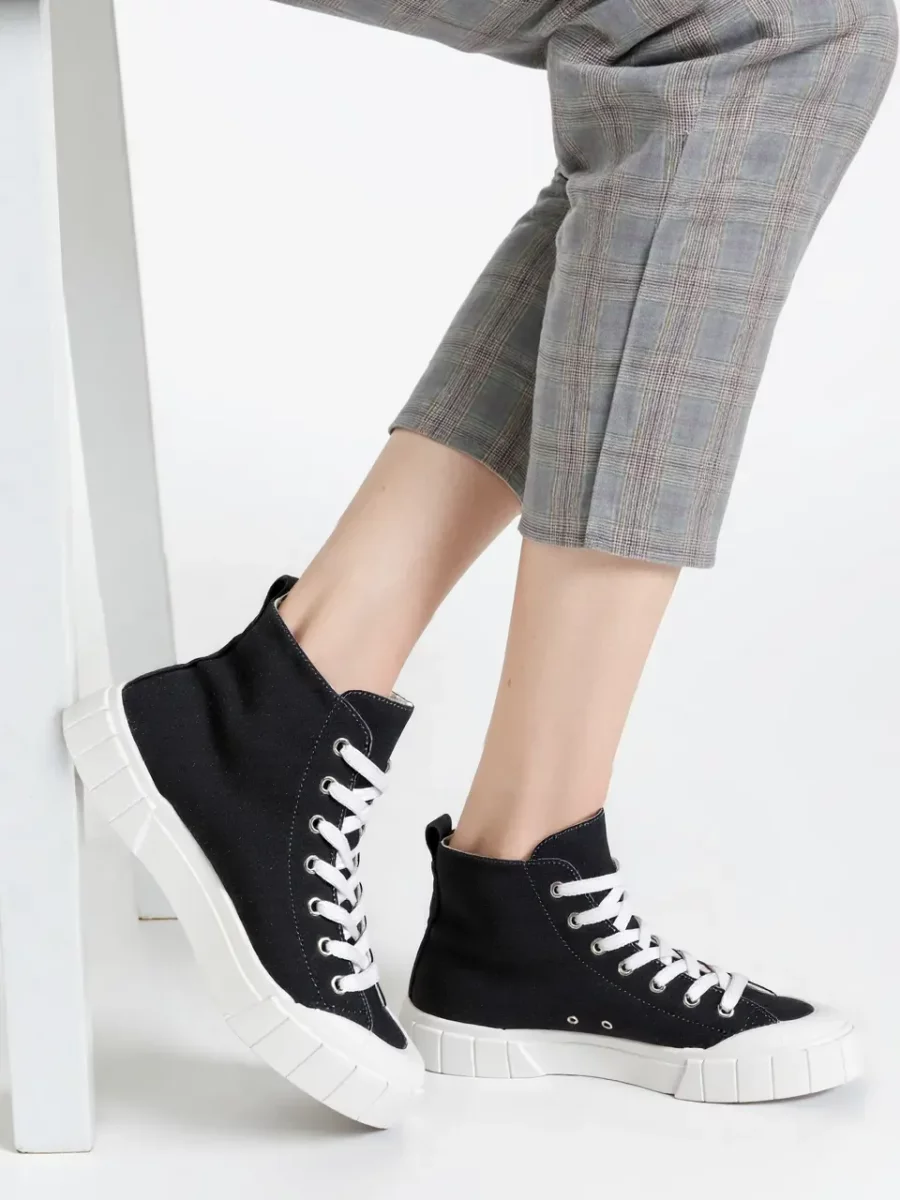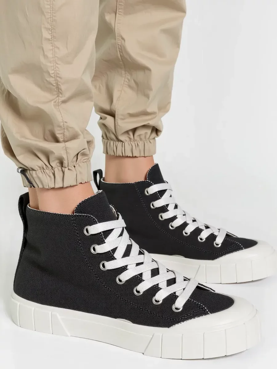 Damskie trampki ARVEL BLACK to klasyczny model o nowoczesnym wyglądzie, który sprawdzi się w każdej garderobie. Wysoka cholewka i gruba podeszwa nadają im niepowtarzalnego charakteru, a czarny kolor zapewnia uniwersalność i elegancję. Wykonane z wysokiej jakości materiałów, zapewniają komfort noszenia przez cały dzień. Idealne zarówno do casualowych, jak i streetwearowych stylizacji.