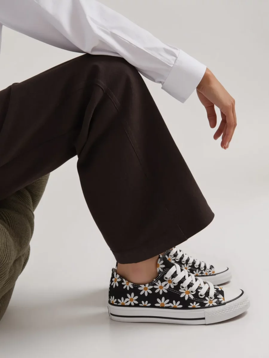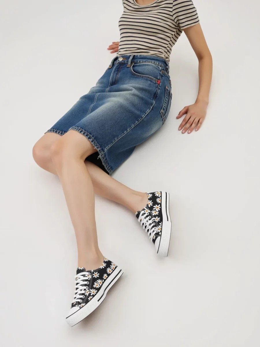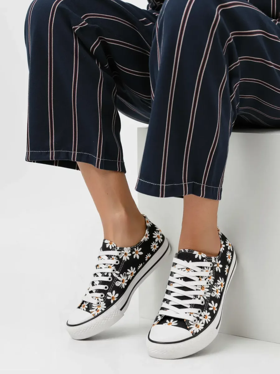Damskie trampki DAISY BLACK to klasyczny model w wyjątkowym, kwiatowym wydaniu. Czarna cholewka ozdobiona białymi stokrotkami nadaje butom dziewczęcego uroku i oryginalnego stylu. Biała, gumowa podeszwa z kontrastowym czarnym paskiem podkreśla ich casualowy charakter. To idealna propozycja dla kobiet ceniących wygodę i modny wygląd.