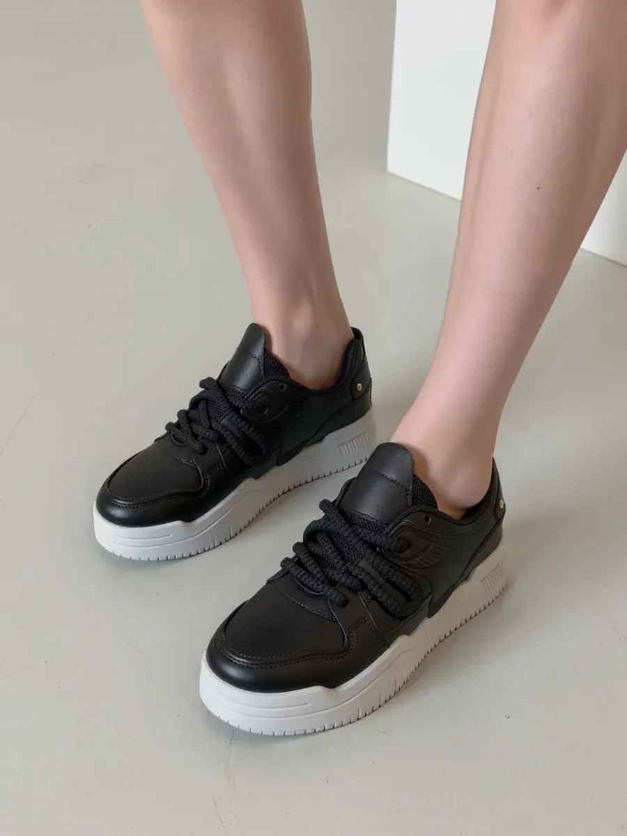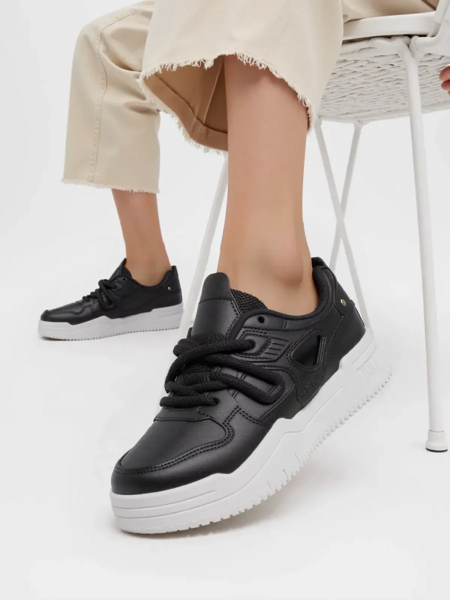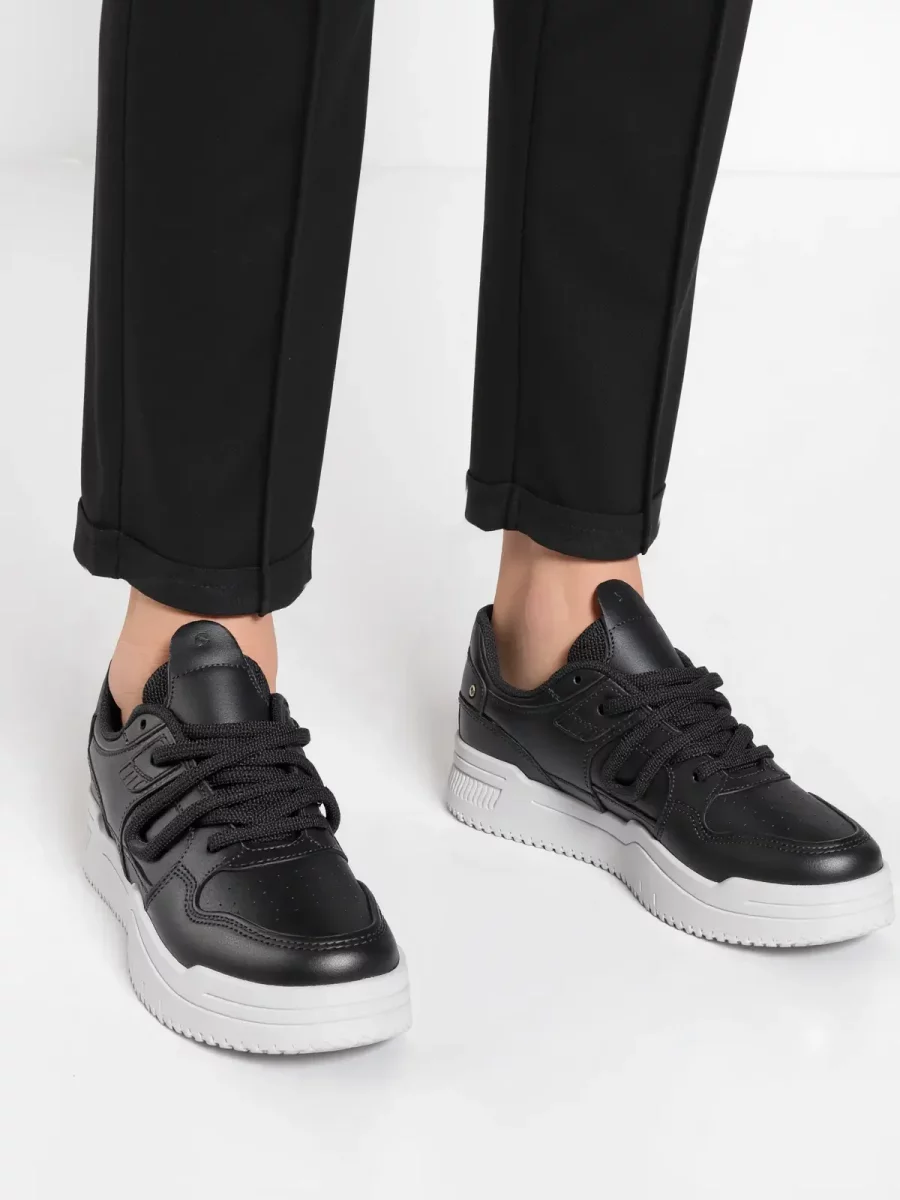 Damskie sneakersy FLARE BLACK to idealne połączenie nowoczesnego stylu i niezrównanej wygody. Ich minimalistyczny design sprawia, że pasują do każdej stylizacji – od sportowych po casualowe. Wykonane z wysokiej jakości materiałów, zapewniają przewiewność i komfort noszenia przez cały dzień. Gruba, profilowana podeszwa nie tylko dodaje charakteru, ale także doskonale amortyzuje każdy krok. Model ten to must-have dla kobiet ceniących modę i wygodę w jednym.