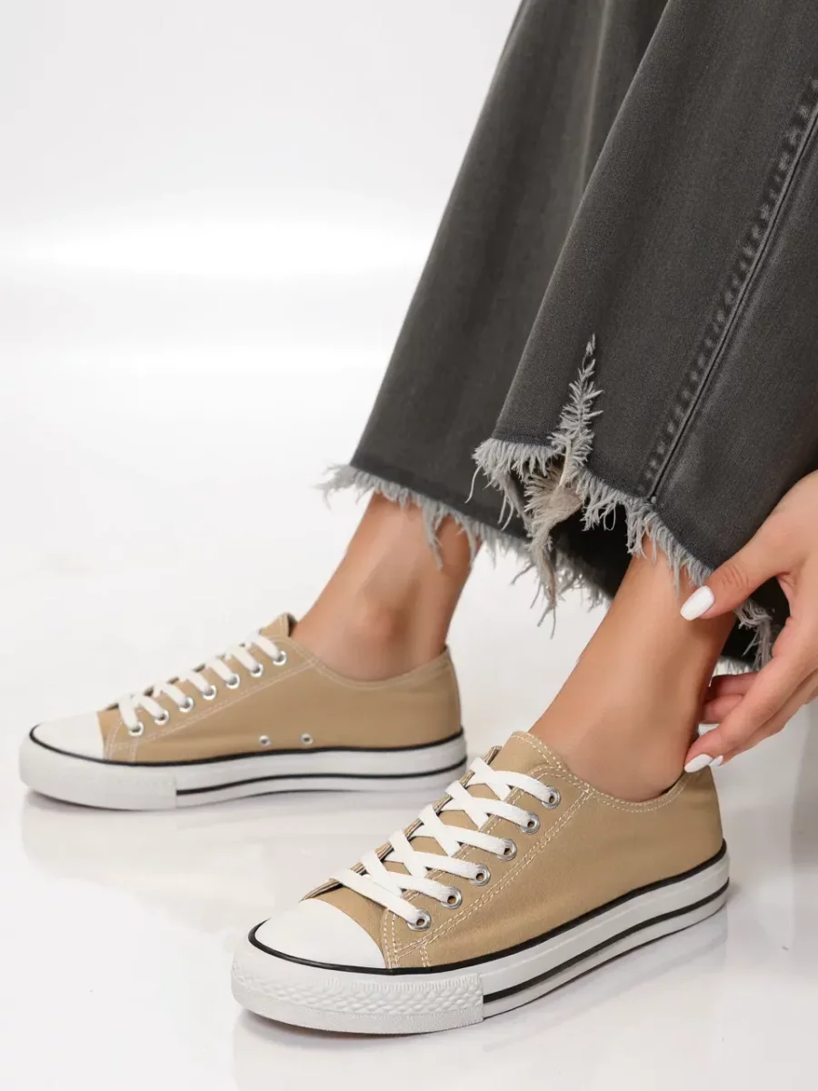 Damskie trampki NERIA KHAKI to stylowy wybór dla kobiet ceniących klasyczny design i wygodę. Wykonane z trwałego materiału tekstylnego w subtelnym odcieniu khaki, doskonale sprawdzą się w codziennych stylizacjach. Gumowa podeszwa z kontrastowym paskiem zapewnia komfort i stabilność, a sznurowane zapięcie pozwala na idealne dopasowanie. To uniwersalny model, który pasuje zarówno do jeansów, jak i letnich sukienek.
