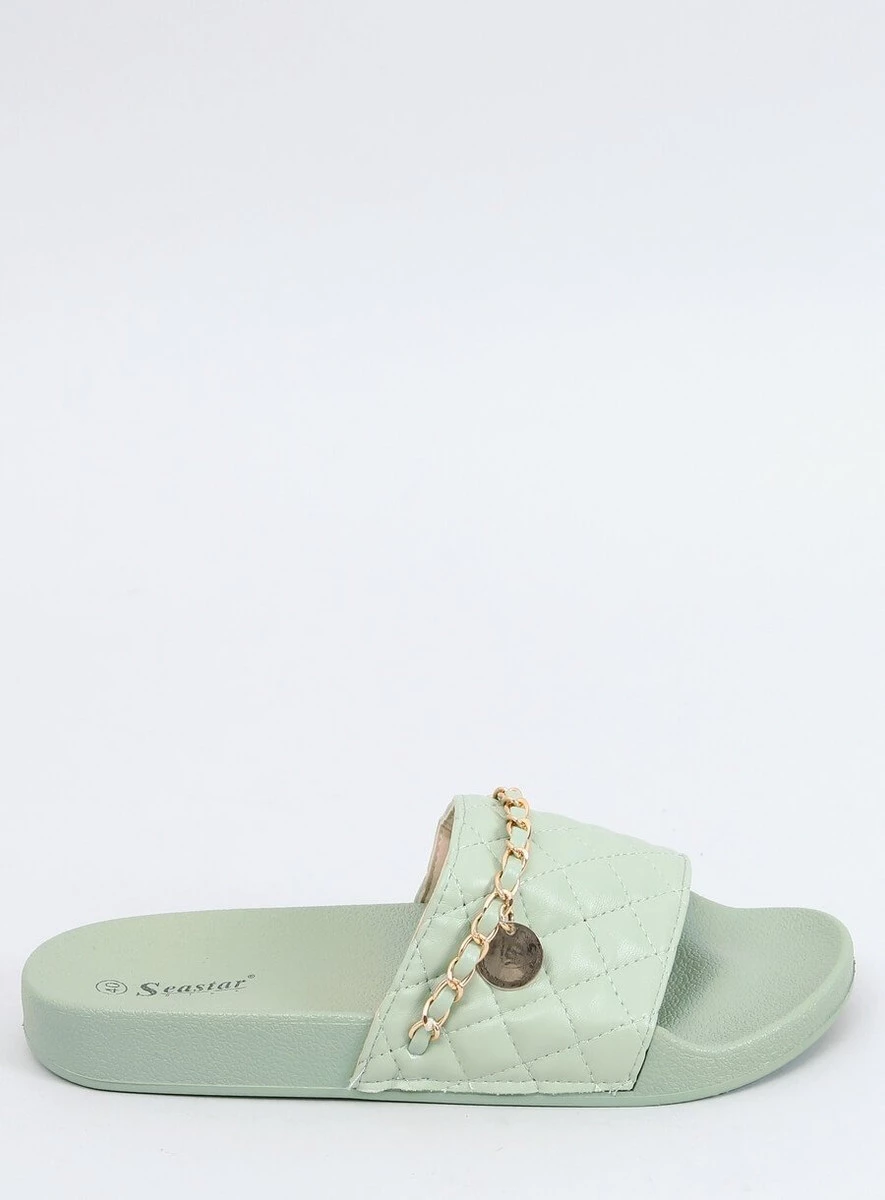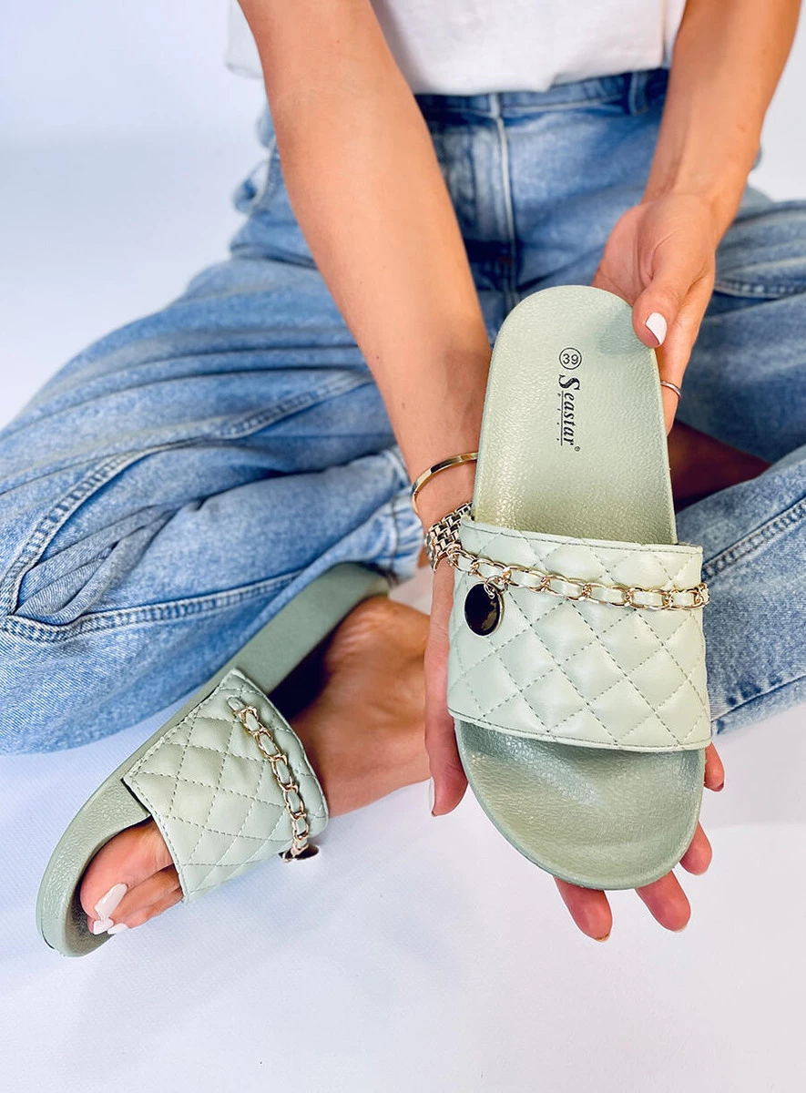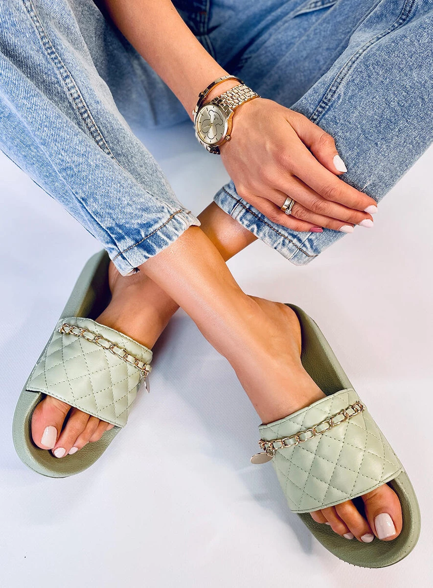 Stylowe klapki damskie. Dla prawdziwych gwiazd tego lata mamy wyjątkowy model z efektownym pikowaniem oraz najmodniejszym łańcuszkiem. Jeśli chcesz przyciągnąć spojrzenia to po prostu musisz je mieć! Materiał zewnętrzny – skóra ekologiczna.