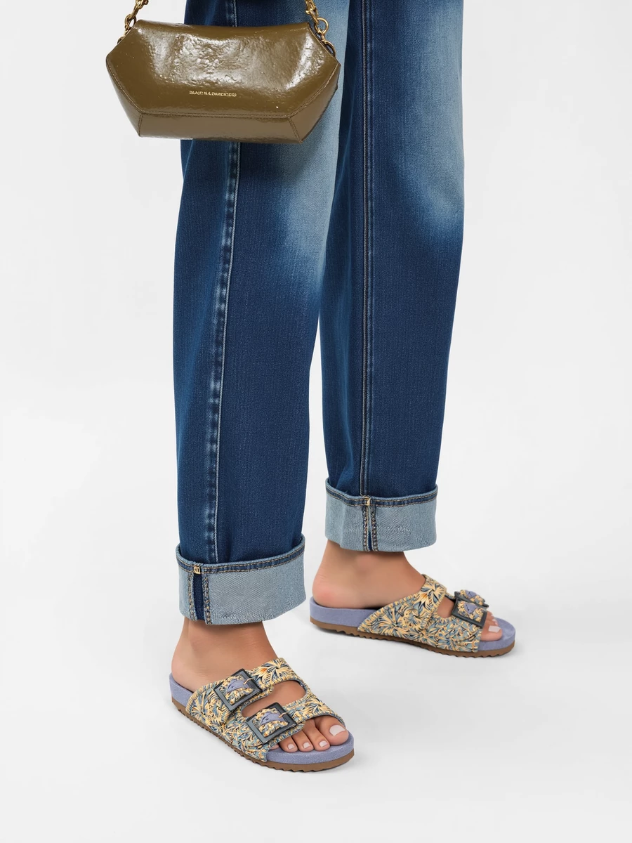 Obuwie charakteryzuje się intrygującym wzorem kwiatowym w odcieniach niebieskiego i beżu, które doskonale komponują się z letnimi strojami.