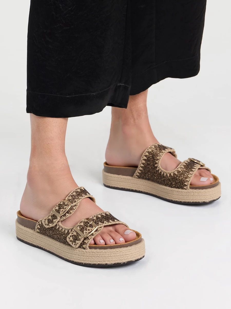 Klapki damskie na koturnie z plecionymi paskami w kolorze Bronze