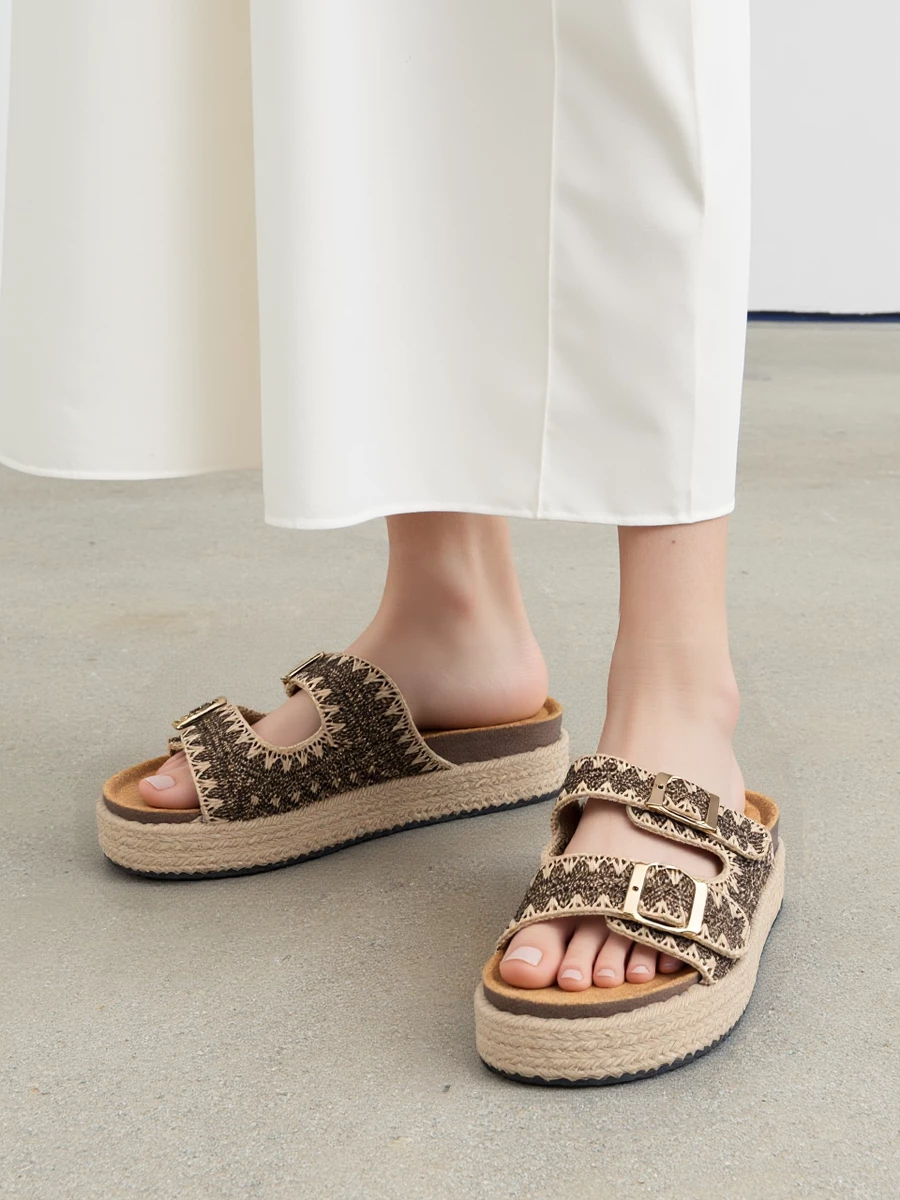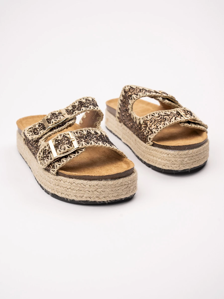Odkryj elegancję i wygodę dzięki naszym klapkom na koturnie. Te stylowe klapki wyposażone są w plecione paski, które dodają unikalnego wyglądu, a metalowe klamry zapewniają dodatkowy akcent. Solidna pleciona platforma nie tylko dodaje wysokości, ale także komfortu podczas noszenia. Idealne na letnie dni i wieczorne wyjścia, te klapki w kolorze Bronze są nie tylko modnym dodatkiem, ale także praktycznym wyborem na każdy dzień.