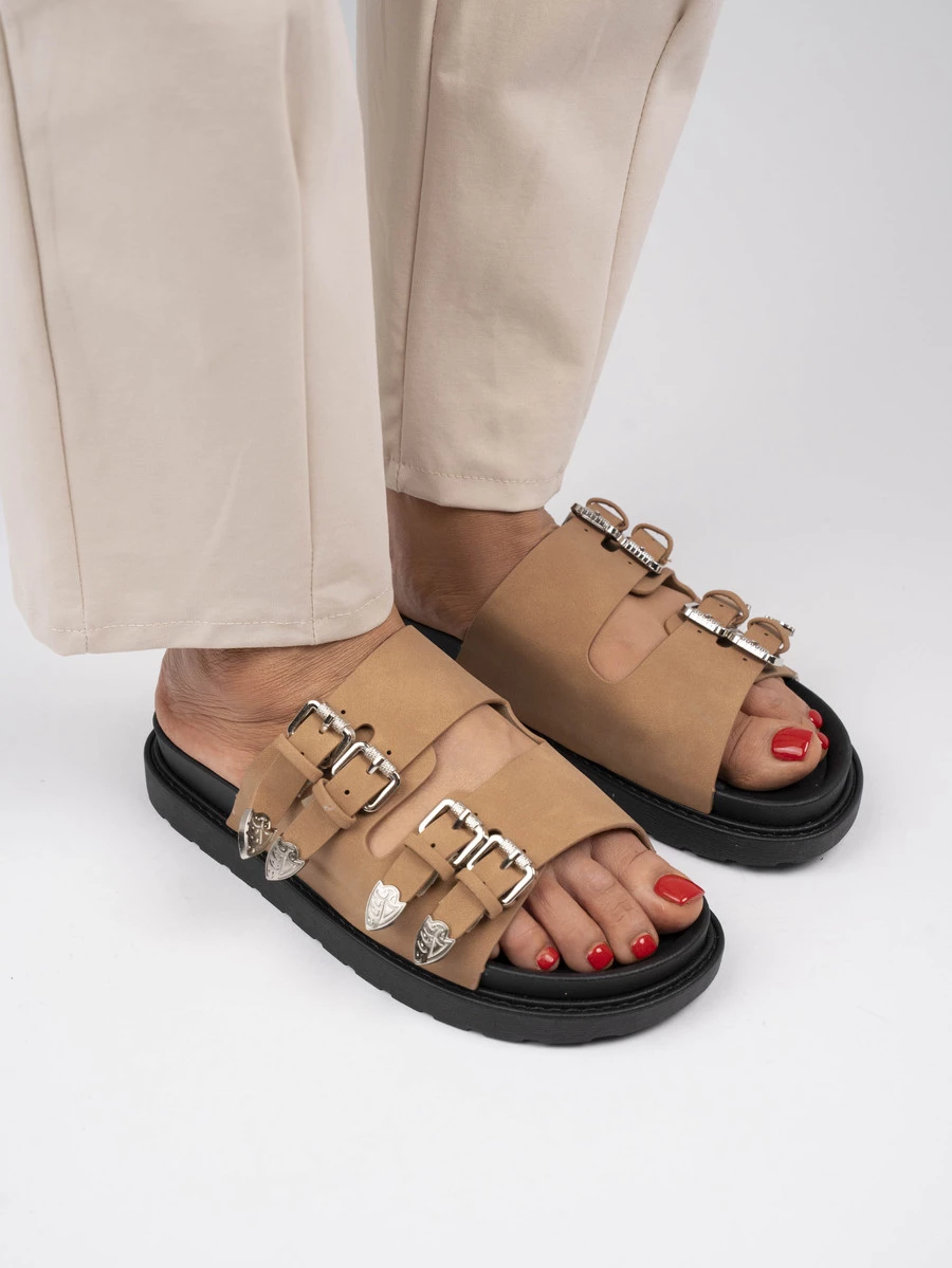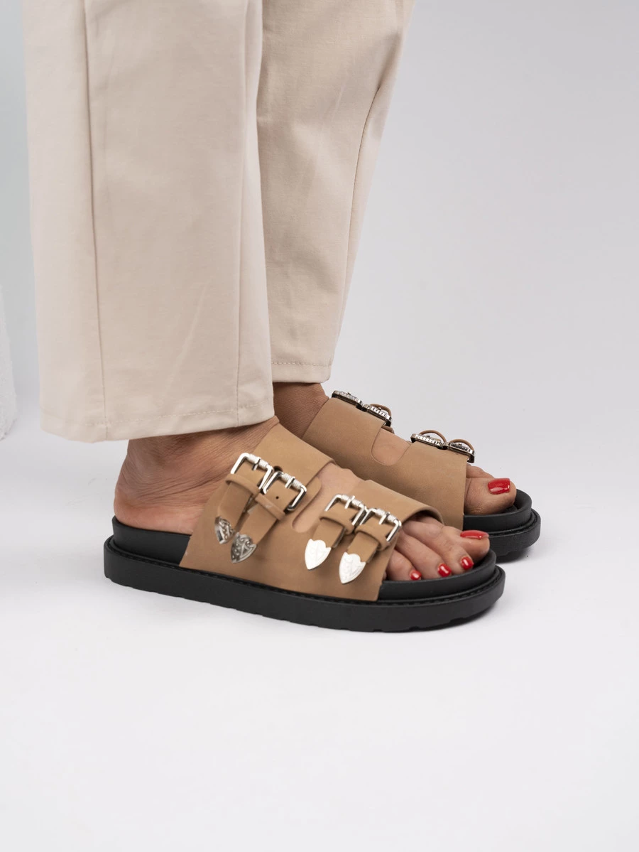 Klapki damskie z klamrami i skórzanymi paskami w kolorze Camel