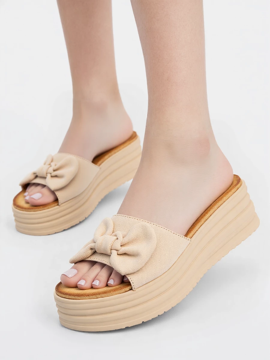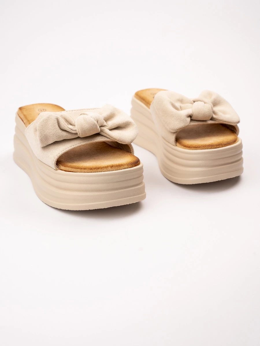 Klapki damskie z kokardą na koturnie w kolorze Beige