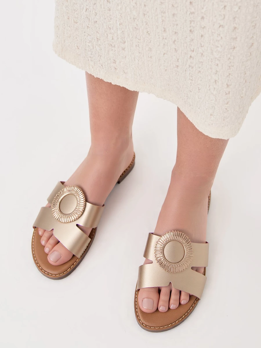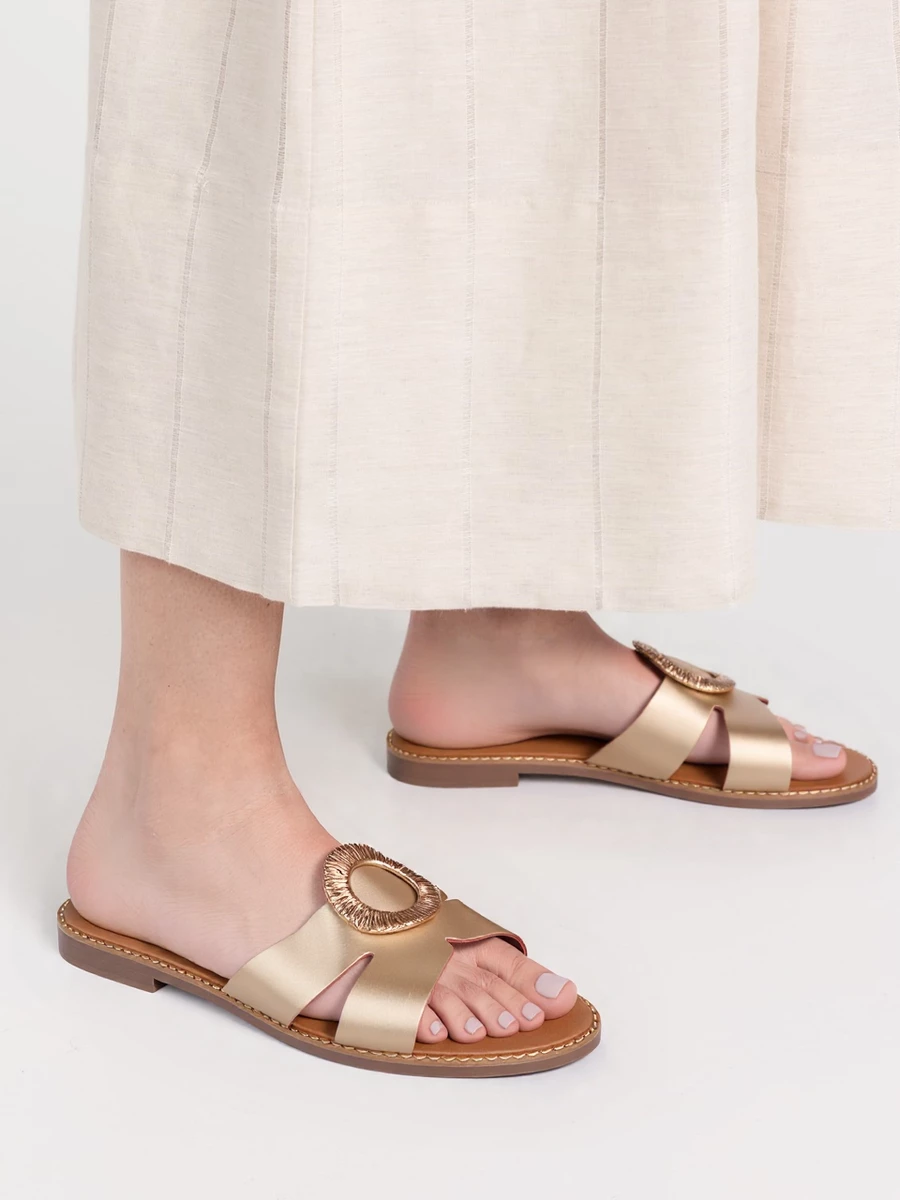 Klapki eleganckie damskie z ozdobną klamrą w kolorze Gold