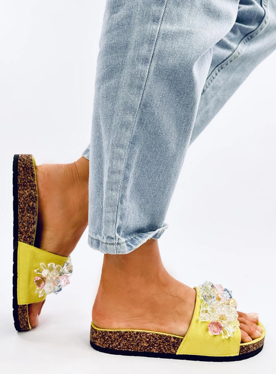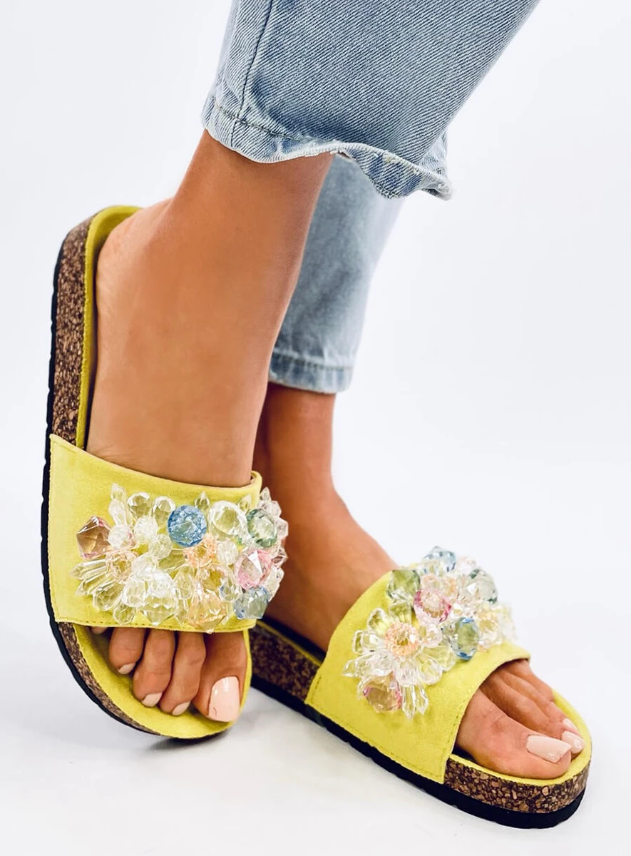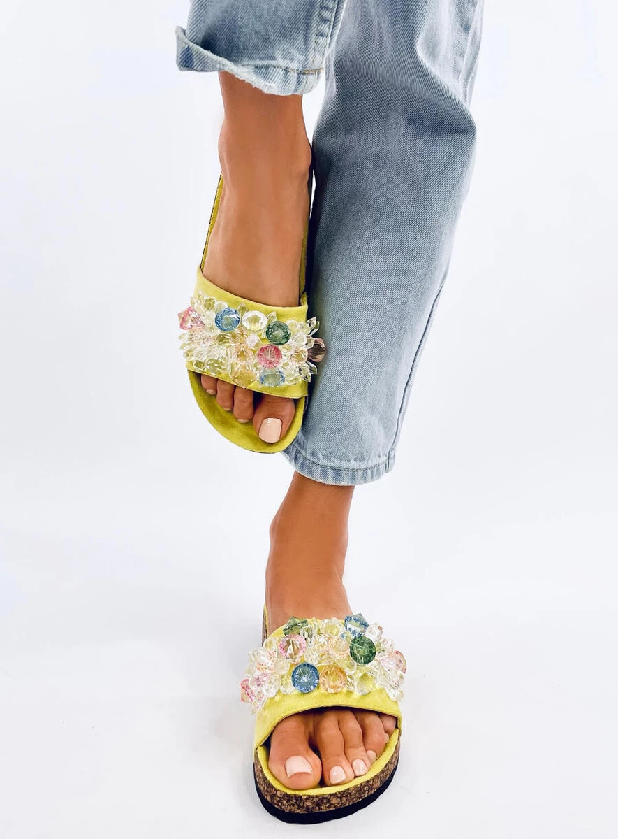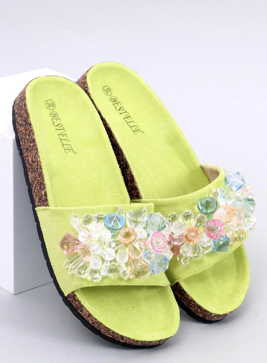 Klapki damskie na korkowej podeszwie. Zamszowy pasek ozdobiony aplikacją z błyszczących, wielokolorowych kryształków nadaje butom wyjątkowego uroku. Jesteśmy przekonane, że te klapki z profilowaną wkładką wewnętrzną spełnią Twoje oczekiwania : ) Materiał zewnętrzny – zamsz ekologiczny.