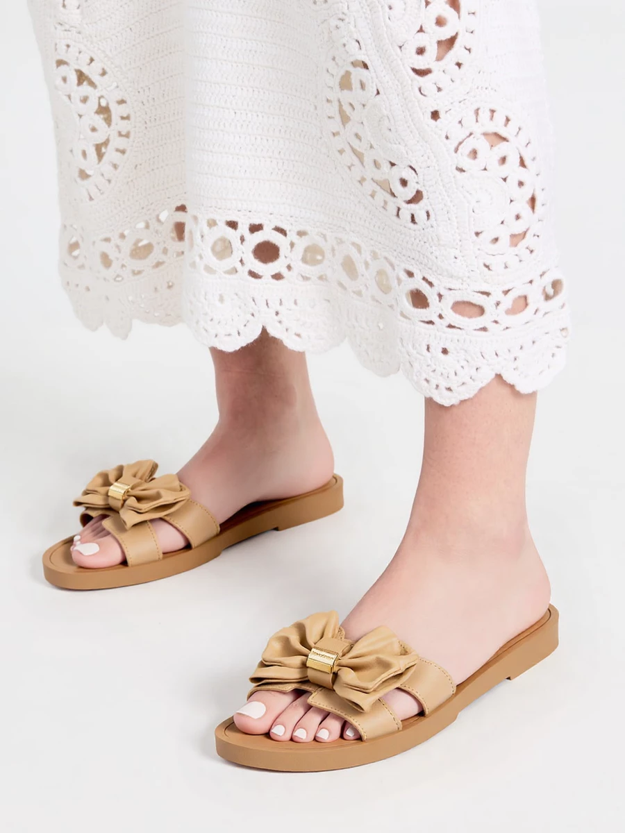 Klapki LUXY BOW (khaki) to eleganckie obuwie, które świetnie komponuje się z letnimi stylizacjami. Duża kokarda na froncie dodaje im kobiecego uroku, a khaki kolor pasuje do wielu outfitów. Wykonane z lekkiego tworzywa sztucznego i wyposażone w gładką plastikową podeszwę, idealne na spacery, wakacyjne wyjazdy czy codzienne wyjścia.
