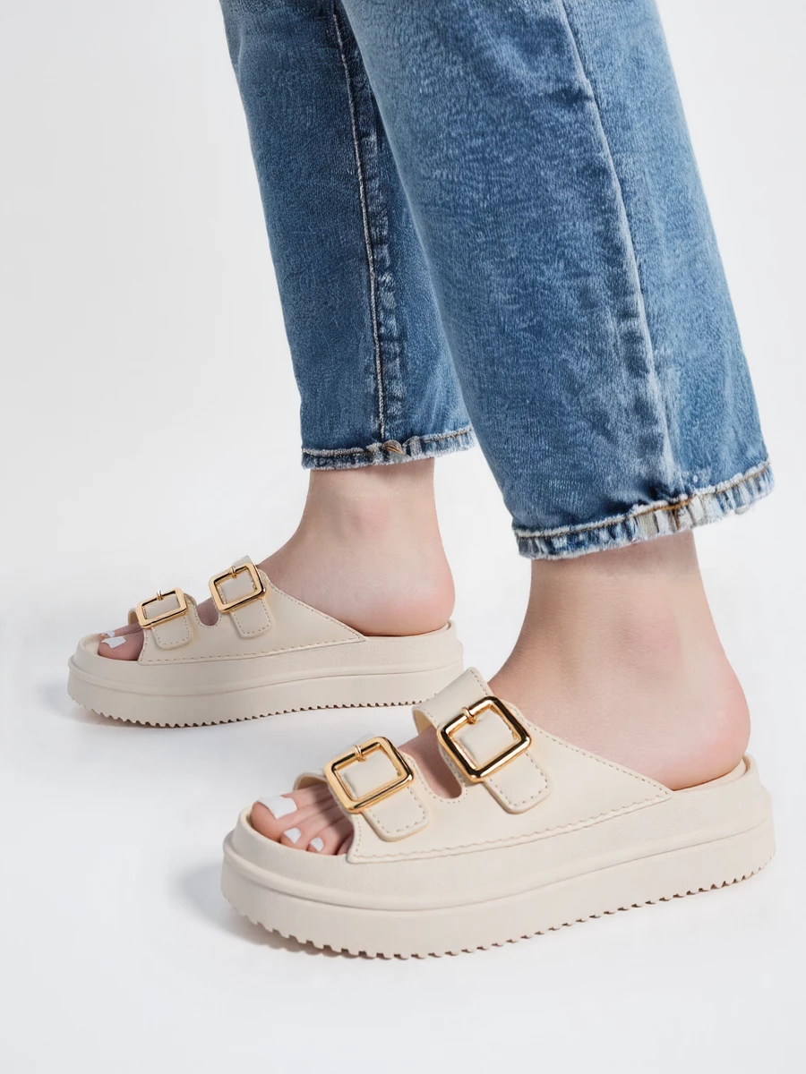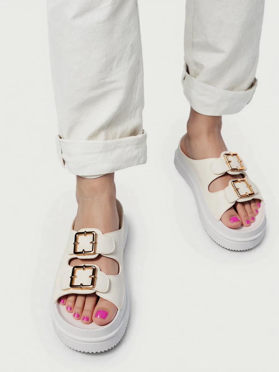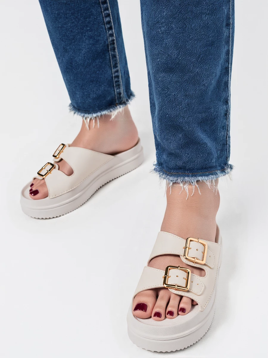 Te eleganckie klapki na koturnie doskonale łączą styl i wygodę. Wykonane z wysokiej jakości materiałów, białe skórzane paski zapewniają trwałość i komfort noszenia. Złote klamry dodają im luksusowego wyglądu, podkreślając nowoczesny design. Dzięki stabilnej platformie, te klapki sprawdzą się zarówno na co dzień, jak i na specjalne okazje. Ich klasyczny fason w kolorze White z łatwością dopasujesz do różnych stylizacji, tworząc modny i świeży look.
