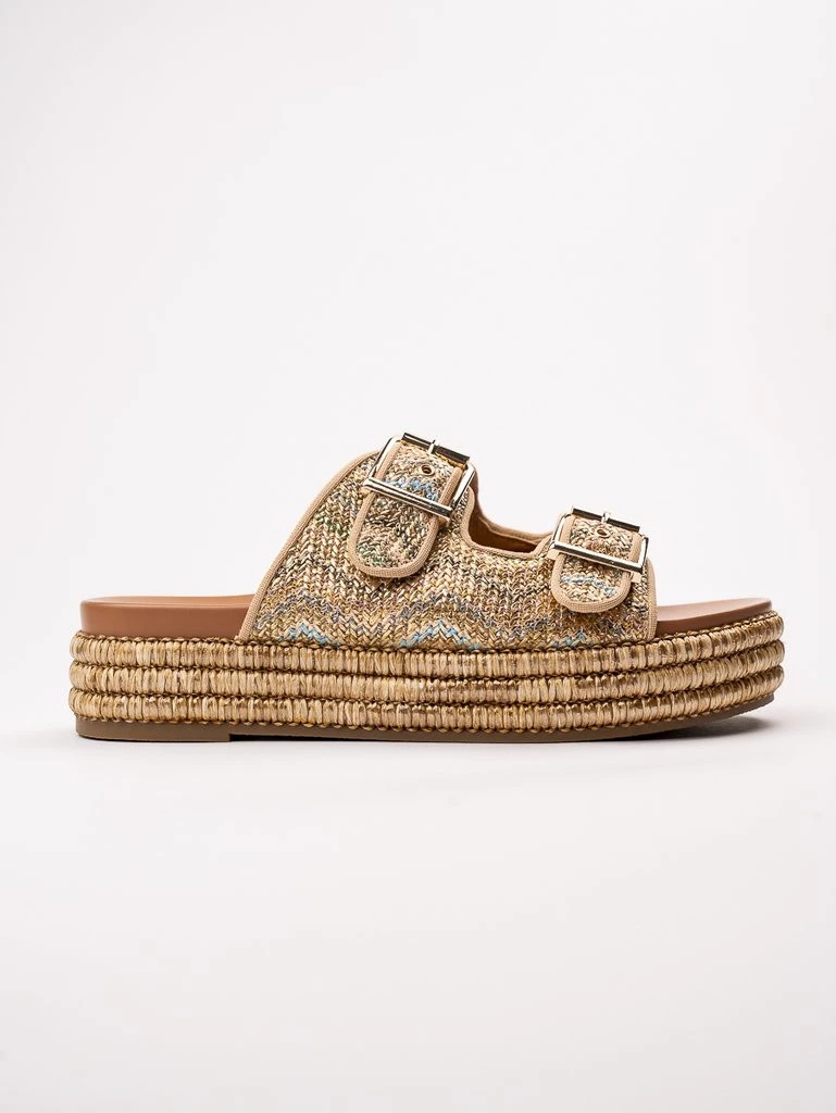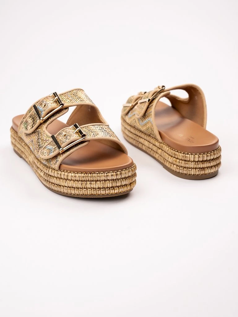 Te eleganckie klapki na koturnie w kolorze Gold to idealne połączenie stylu i komfortu. Posiadają podwójną klamrę, która dodaje im nowoczesnego charakteru, a pleciona podeszwa zapewnia wygodę noszenia. Doskonałe na letnie dni, kiedy chcesz wyglądać modnie i czuć się swobodnie.