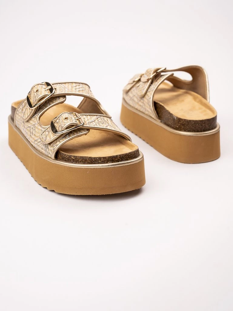 Stylowe klapki na koturnie z podwójną klamrą w kolorze Silver to idealny wybór na letnie dni. Wykonane z wysokiej jakości materiałów, zapewniają komfort i modny wygląd. Srebrny kolor dodaje elegancji, a solidna podeszwa gwarantuje stabilność.