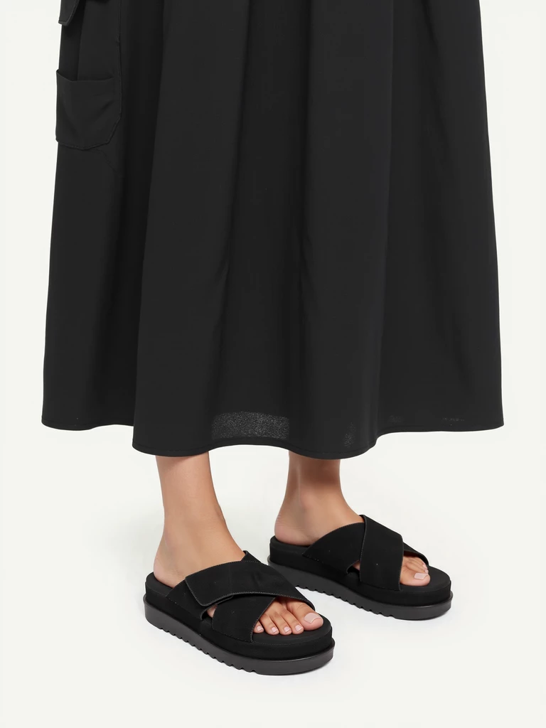Te eleganckie klapki na koturnie w kolorze Black to idealne połączenie stylu i komfortu. Wyposażone w szeroki pasek, zapewniają stabilność i wygodę podczas noszenia. Idealne na letnie dni, dodadzą szyku każdej stylizacji.