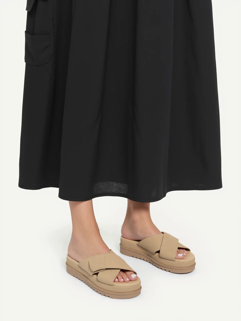 Stylowe klapki na koturnie z szerokim paskiem w kolorze Khaki to idealny wybór na letnie dni. Wygodna platforma zapewnia komfort noszenia, a modny design dodaje elegancji każdej stylizacji.