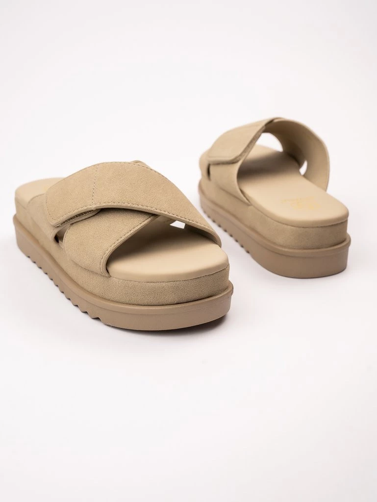 Klapki na koturnie z szerokim paskiem w kolorze Khaki
