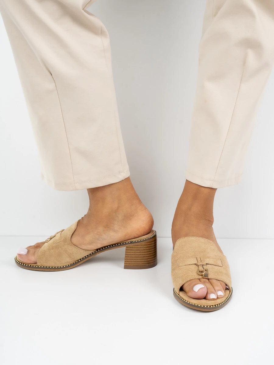 Klapki na obcasie eleganckie z ozdobnym detalem w kolorze Khaki