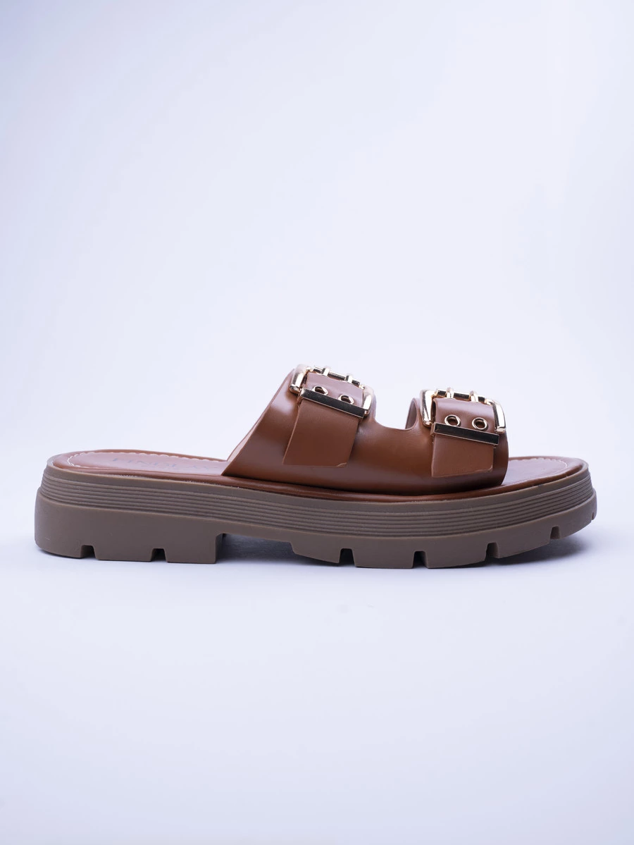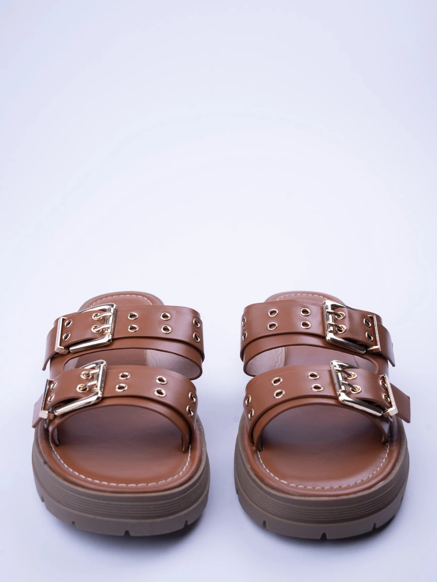 Klapki na obcasie z metalowymi klamrami w kolorze Camel