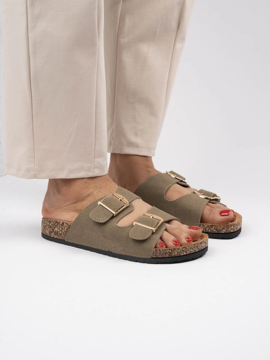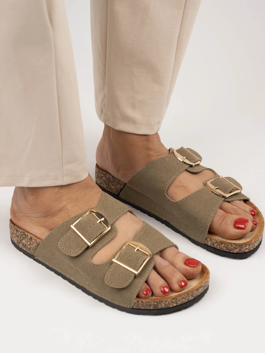 Te eleganckie klapki płaskie wykonane są z wysokiej jakości skóry i zapewniają wygodę oraz styl na co dzień. Dwa skórzane paski z regulowanymi metalowymi klamrami pozwalają na idealne dopasowanie obuwia do stopy. Korekowa podeszwa nie tylko gwarantuje wsparcie, ale także dodaje naturalnego uroku. Idealne na letnie dni, te klapki w kolorze Green będą doskonałym uzupełnieniem każdej casualowej stylizacji.