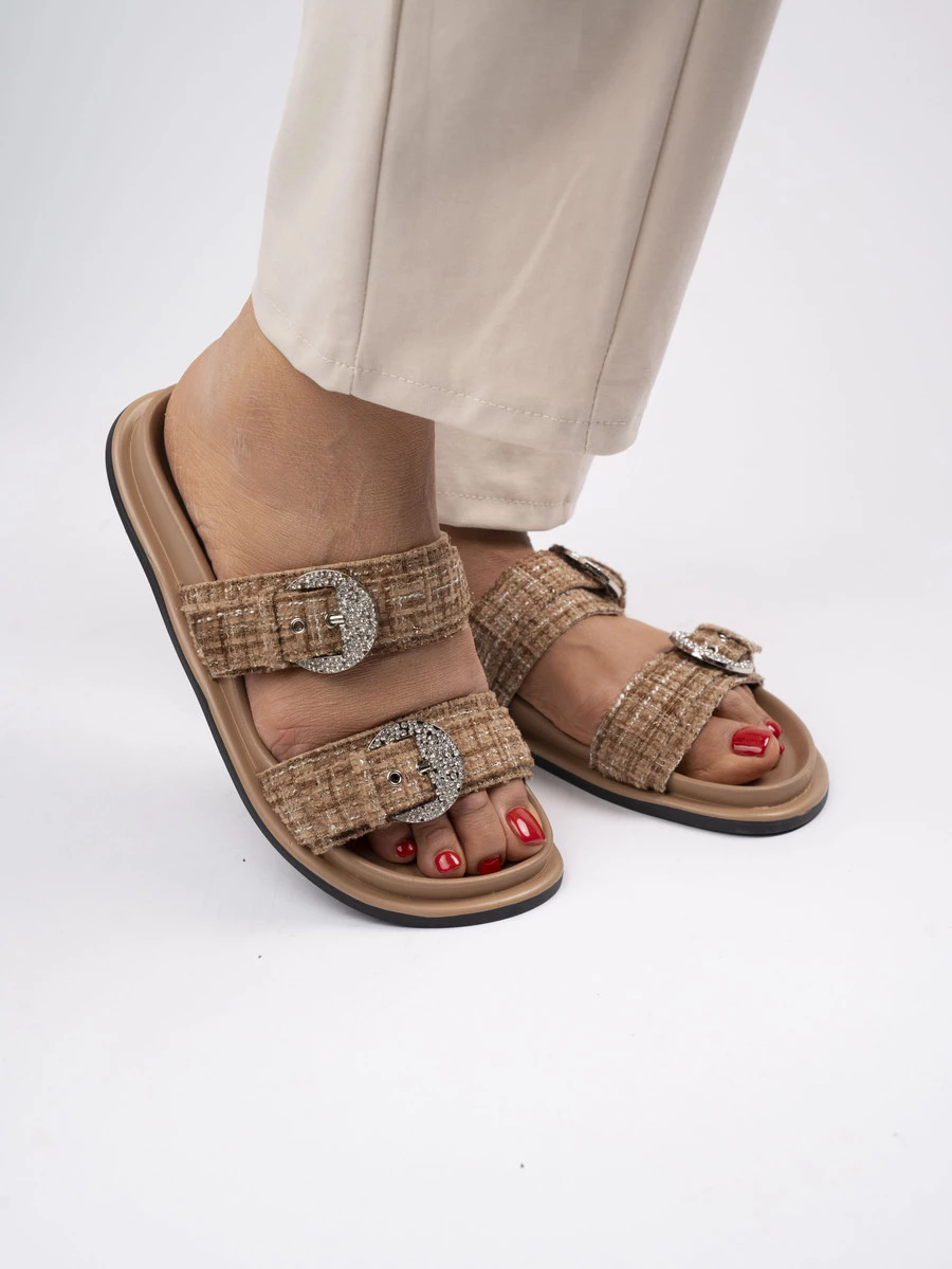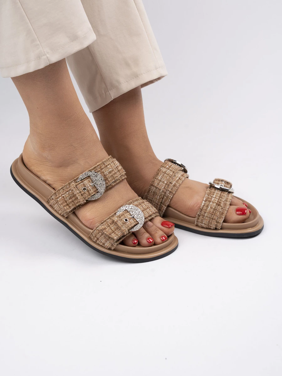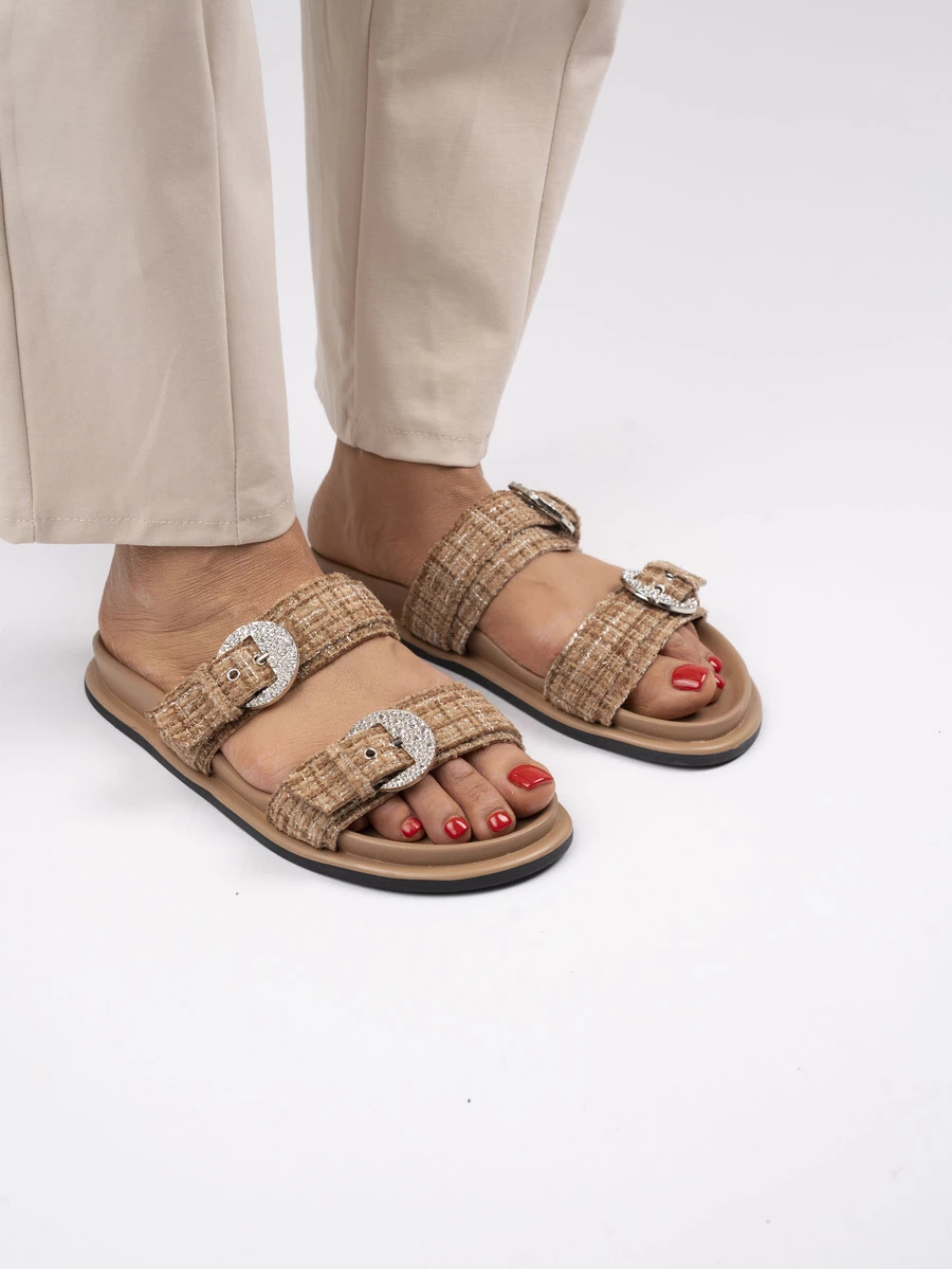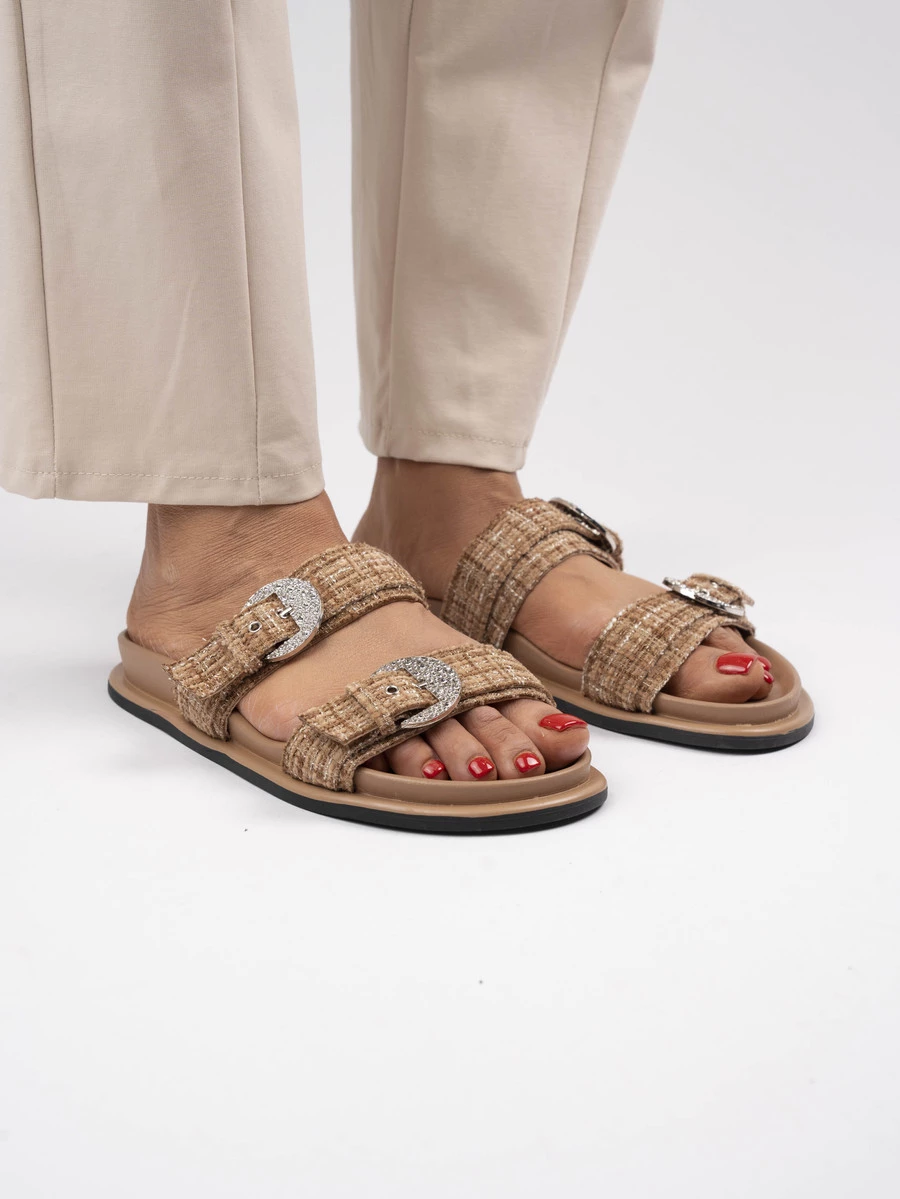Klapki płaskie z ozdobną klamrą w kolorze Khaki