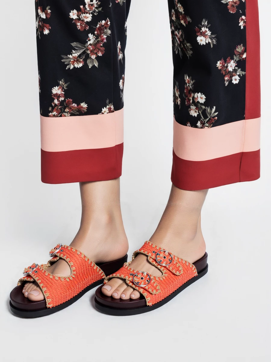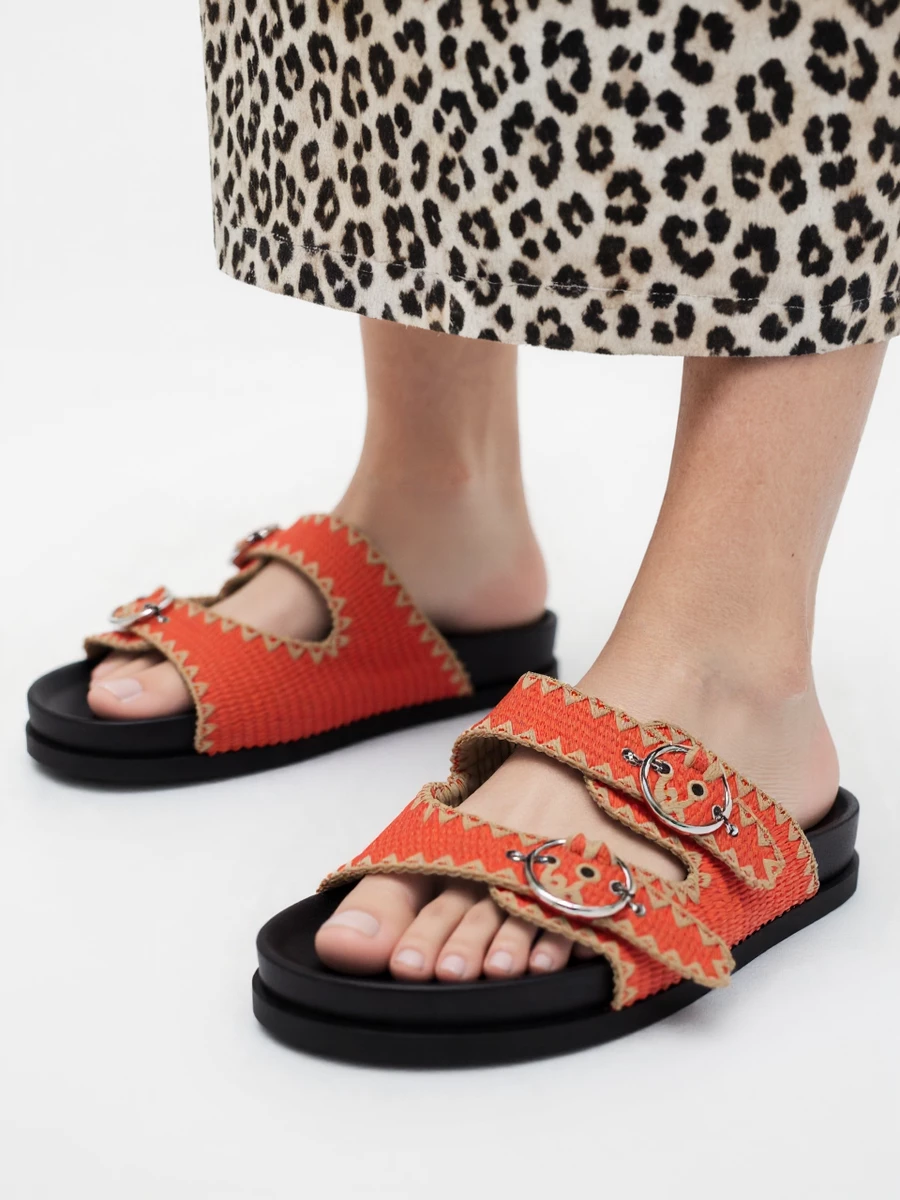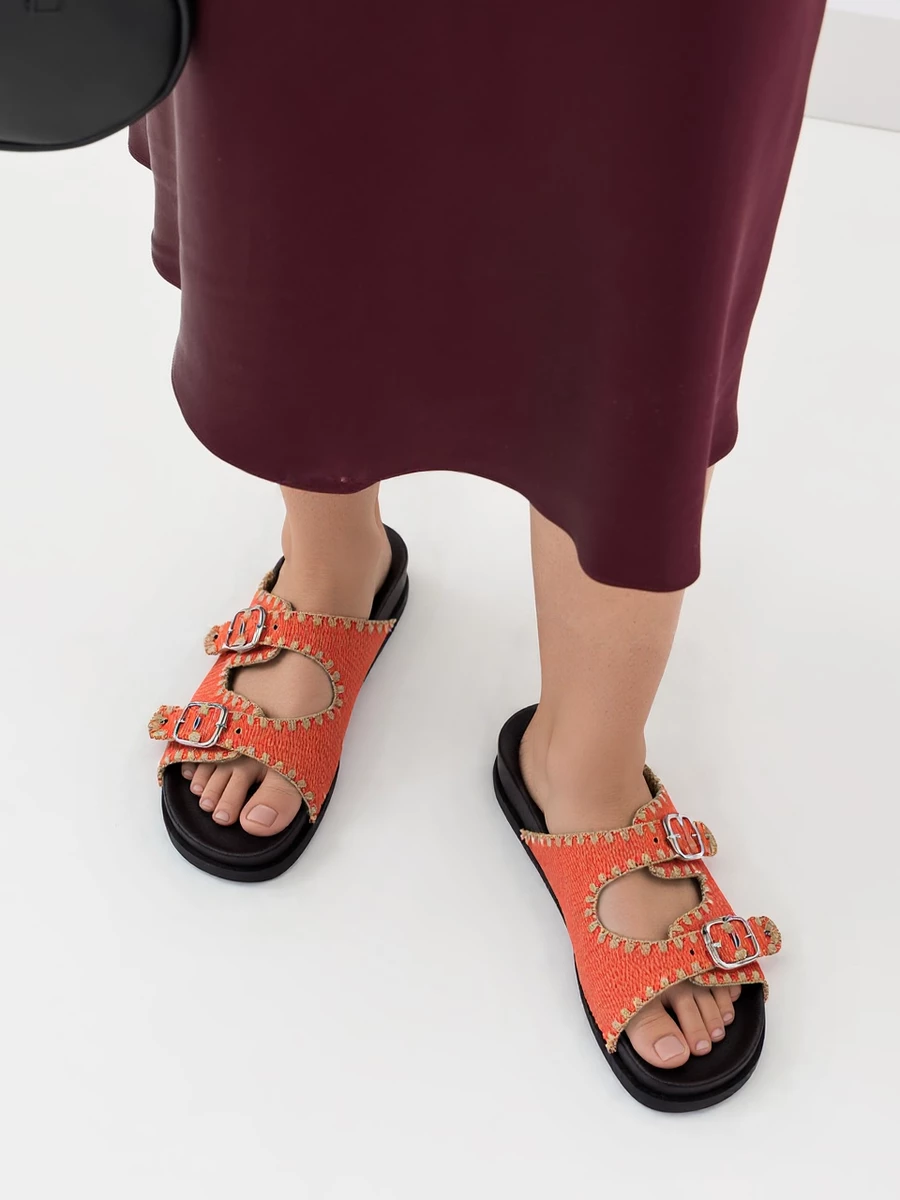 Klapki płaskie, które wyróżniają się unikalnym plecionym designem w stylu rattanu, idealne na letnie dni. Te modne klapki posiadają dwa regulowane paski z metalicznymi klamrami, co zapewnia doskonałe dopasowanie do stopy. Komfortowe wnętrze z wyściełaną wkładką sprawia, że są one wygodne nawet podczas długiego noszenia. Elegancki kolor Orange dodaje energii każdej stylizacji, podkreślając Twoją indywidualność. Doskonałe do noszenia zarówno na plażę, jak i na codzienną przechadzkę po mieście.