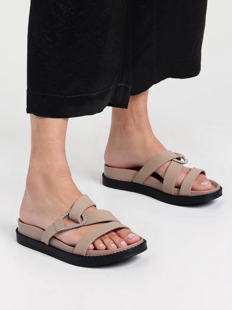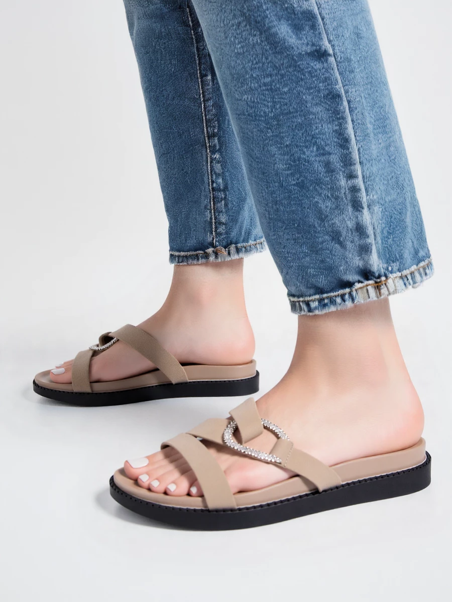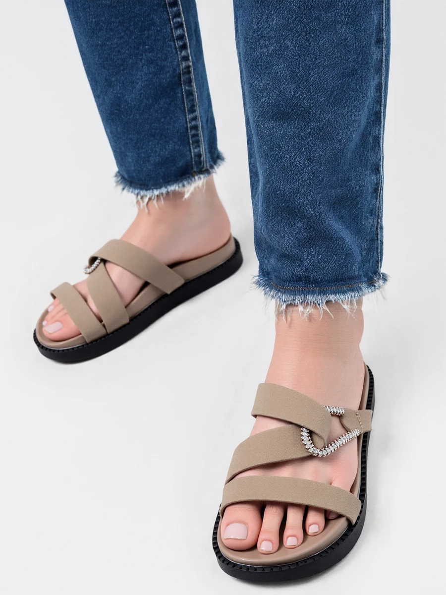 Klapki płaskie z zamszowymi paskami i klamrą w kolorze Beige