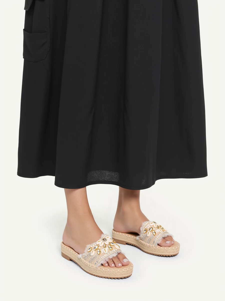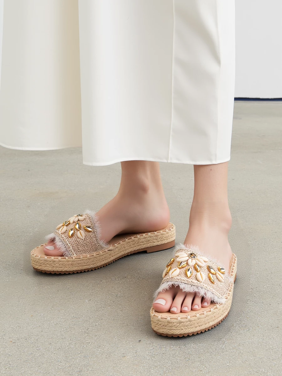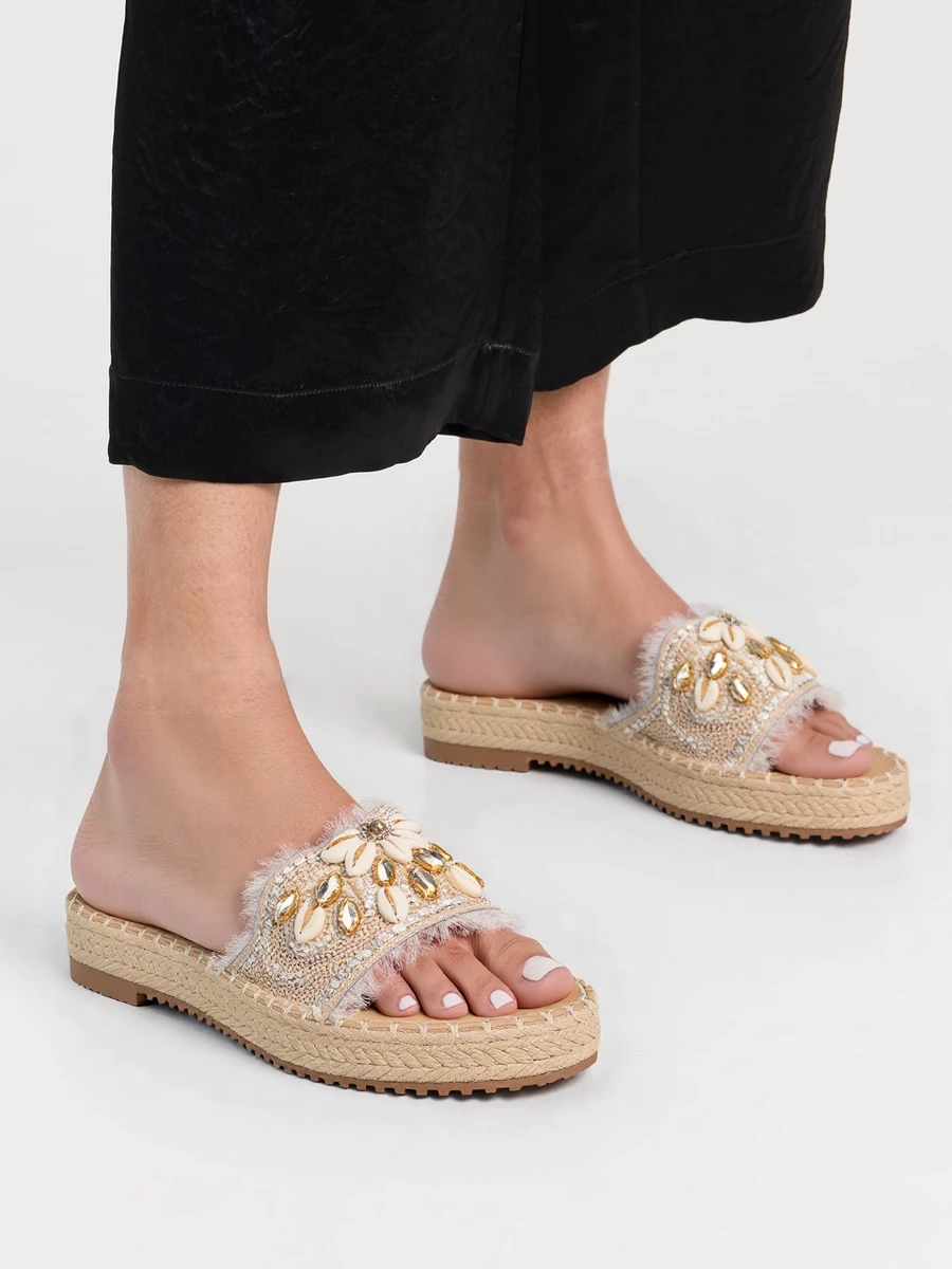 Miękka, futrzana wyściółka zapewnia wygodę, a pleciona podeszwa dodaje subtelnego, etnicznego uroku.