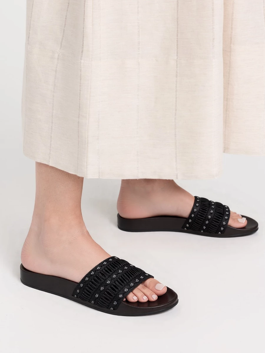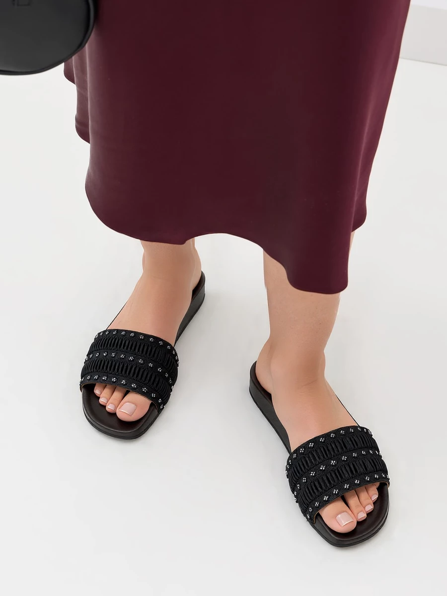 Klapki RUFFLE SLIDE (czarne) to ponadczasowe obuwie, które idealnie komponuje się z eleganckimi, jak i codziennymi stylizacjami. Wykonane z materiału tekstylnego, z ozdobną falbanką i cyrkoniami, które nadają im elegancki wygląd. Podeszwa z gumy lub tworzywa sztucznego zapewnia komfort na każdym kroku. Czarne klapki to klasyka, która pasuje do wszystkiego.
