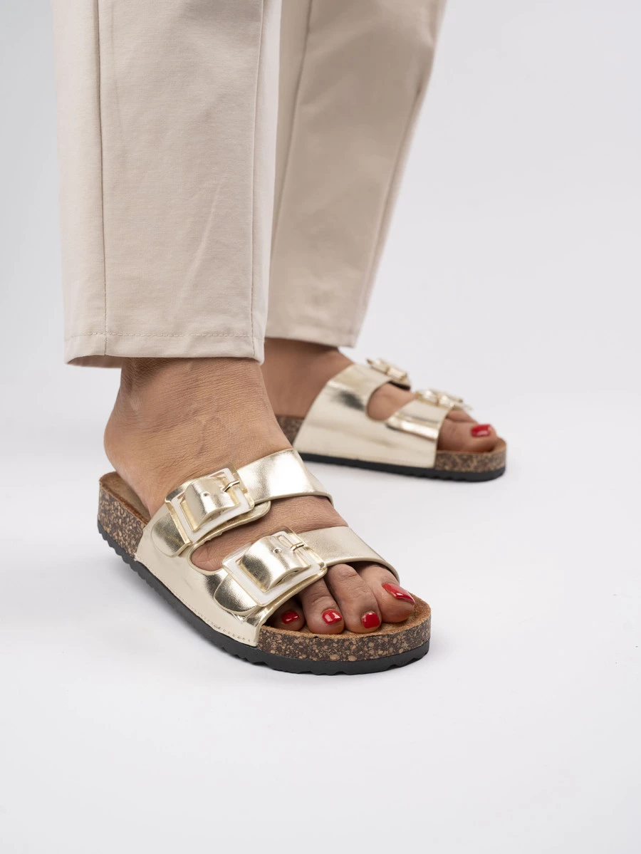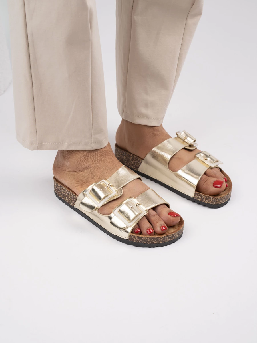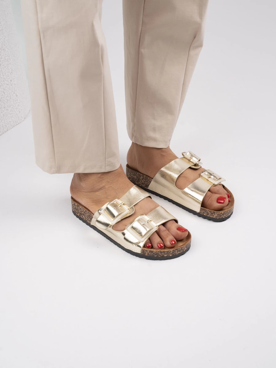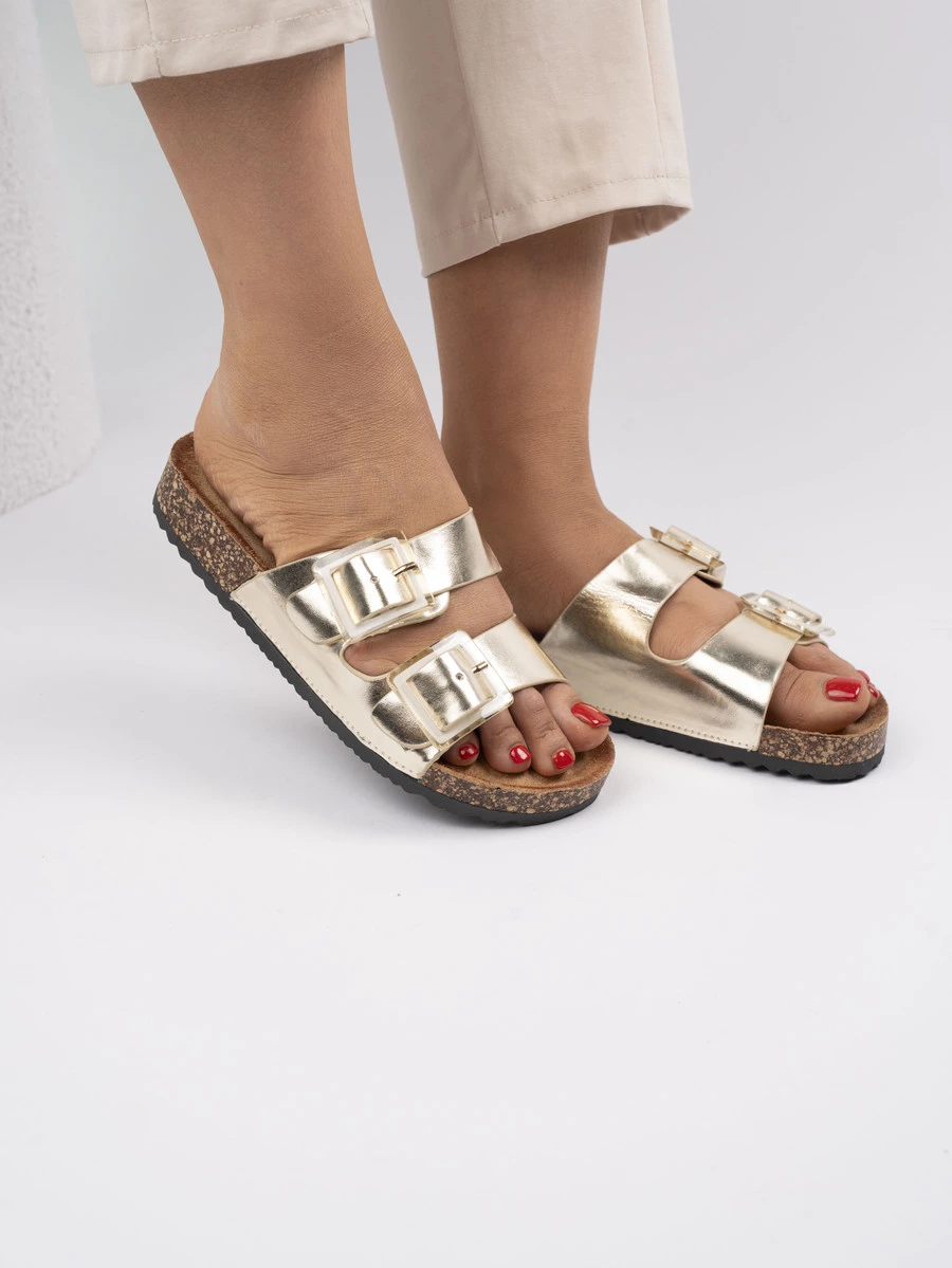 Klapki skórzane z podwójnymi klamrami w kolorze Gold