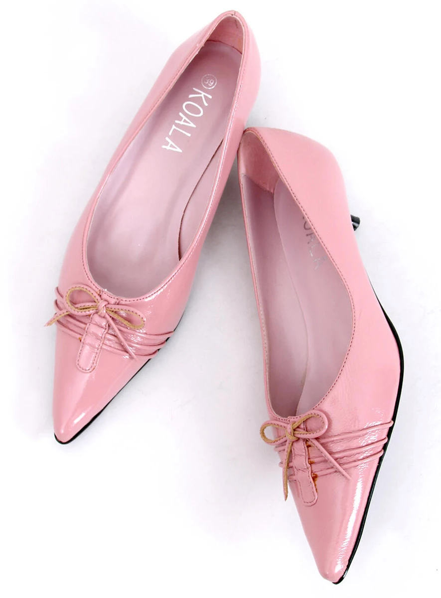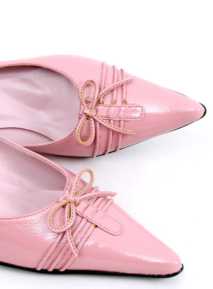Prześliczne czółenka damskie na wygodnym, niewysokim obcasie. Model wyróżnia się noskiem w szpic i ozdobną kokardką. Wykonane z lakierowanej skóry ekologicznej.