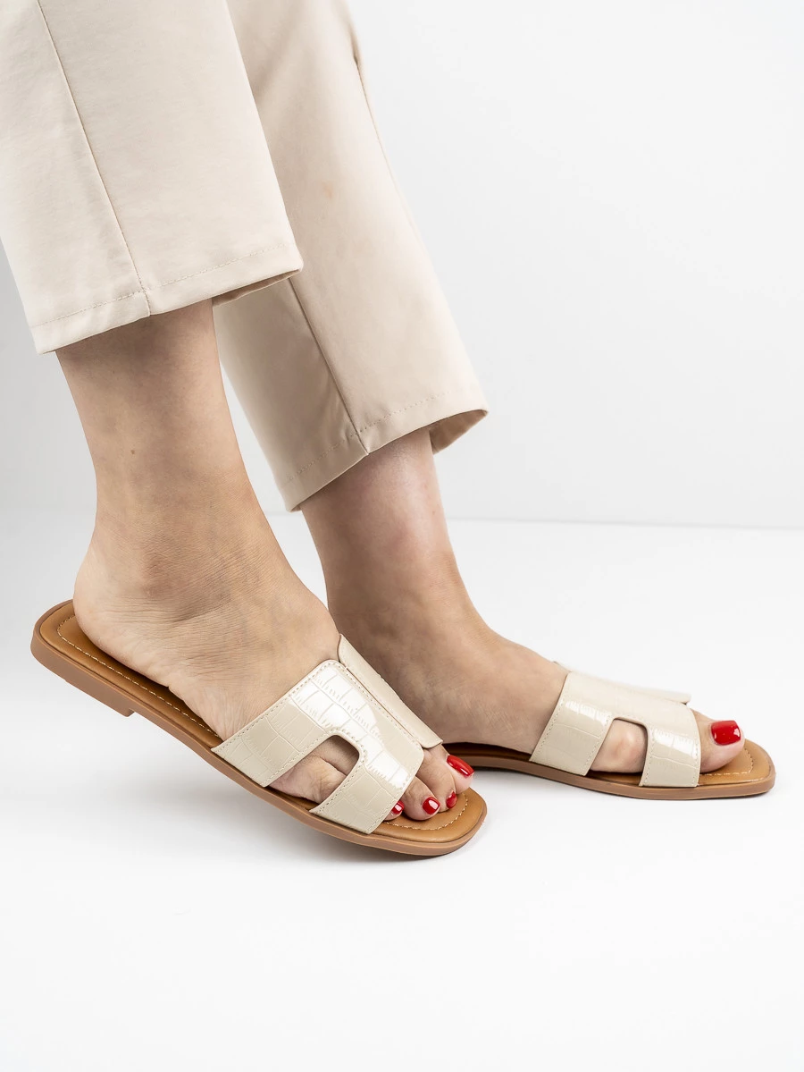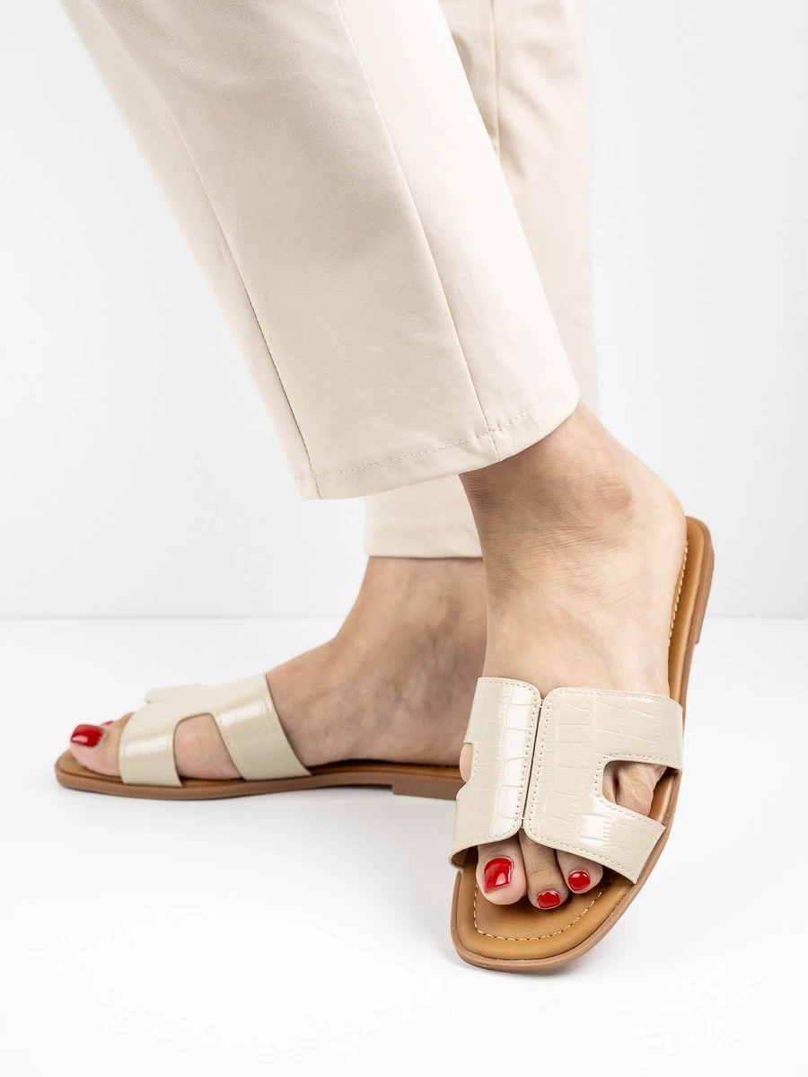 Klapki Zara-001 Beige to wyjątkowa propozycja dla kobiet ceniących styl i komfort. Wykonane z materiału imitującego skórę krokodyla, te klapki przyciągają wzrok eleganckim wykończeniem. Płaska podeszwa zapewnia wygodę podczas codziennego użytkowania, a otwarty design idealnie sprawdzi się w cieplejsze dni. Beige kolor dodaje uniwersalności, pasując do wielu letnich stylizacji. Doskonałe zarówno na spacer, jak i na plażę. Dzięki klasycznej estetyce i praktyczności, klapki te staną się nieodłącznym elementem Twojej garderoby.