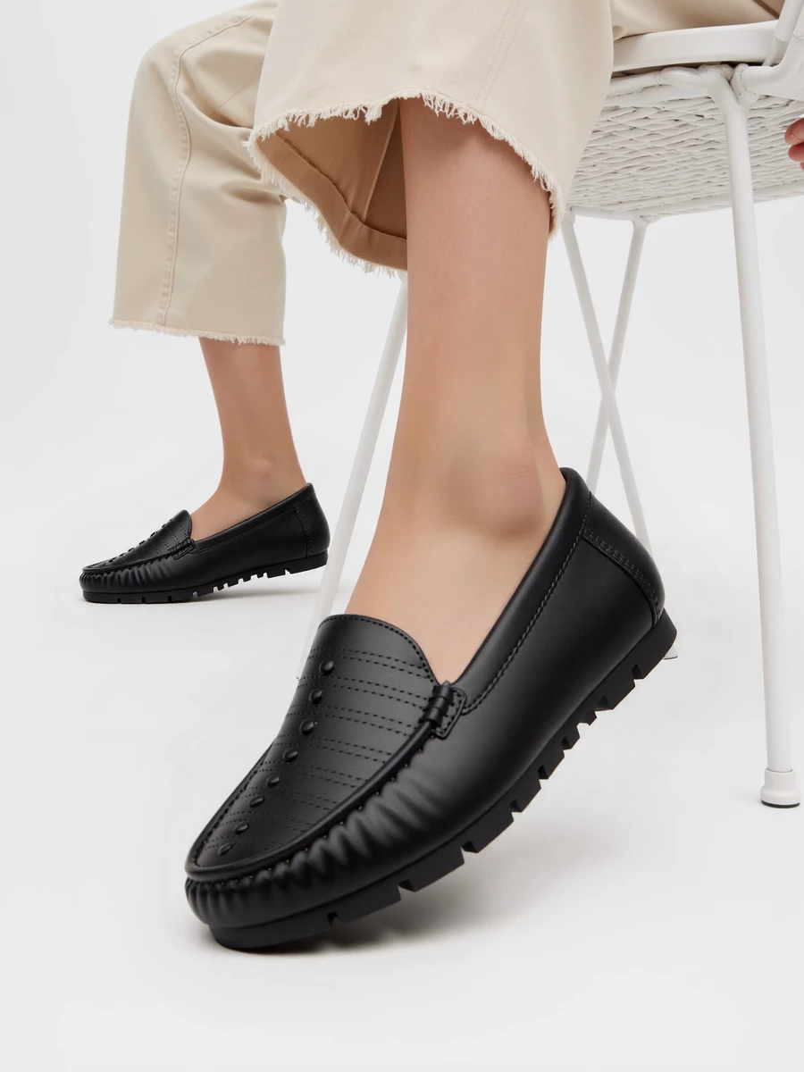 Mokasyny Aurora Black to połączenie stylu i wygody, idealne do codziennych stylizacji. Wykonane z wysokiej jakości materiałów, zapewniają komfort noszenia przez cały dzień. Klasyczny czarny kolor sprawia, że są uniwersalnym dodatkiem, doskonałym na spotkania biznesowe lub spacery po mieście.