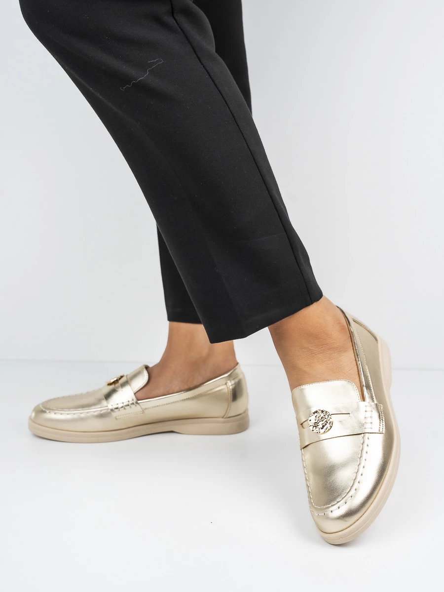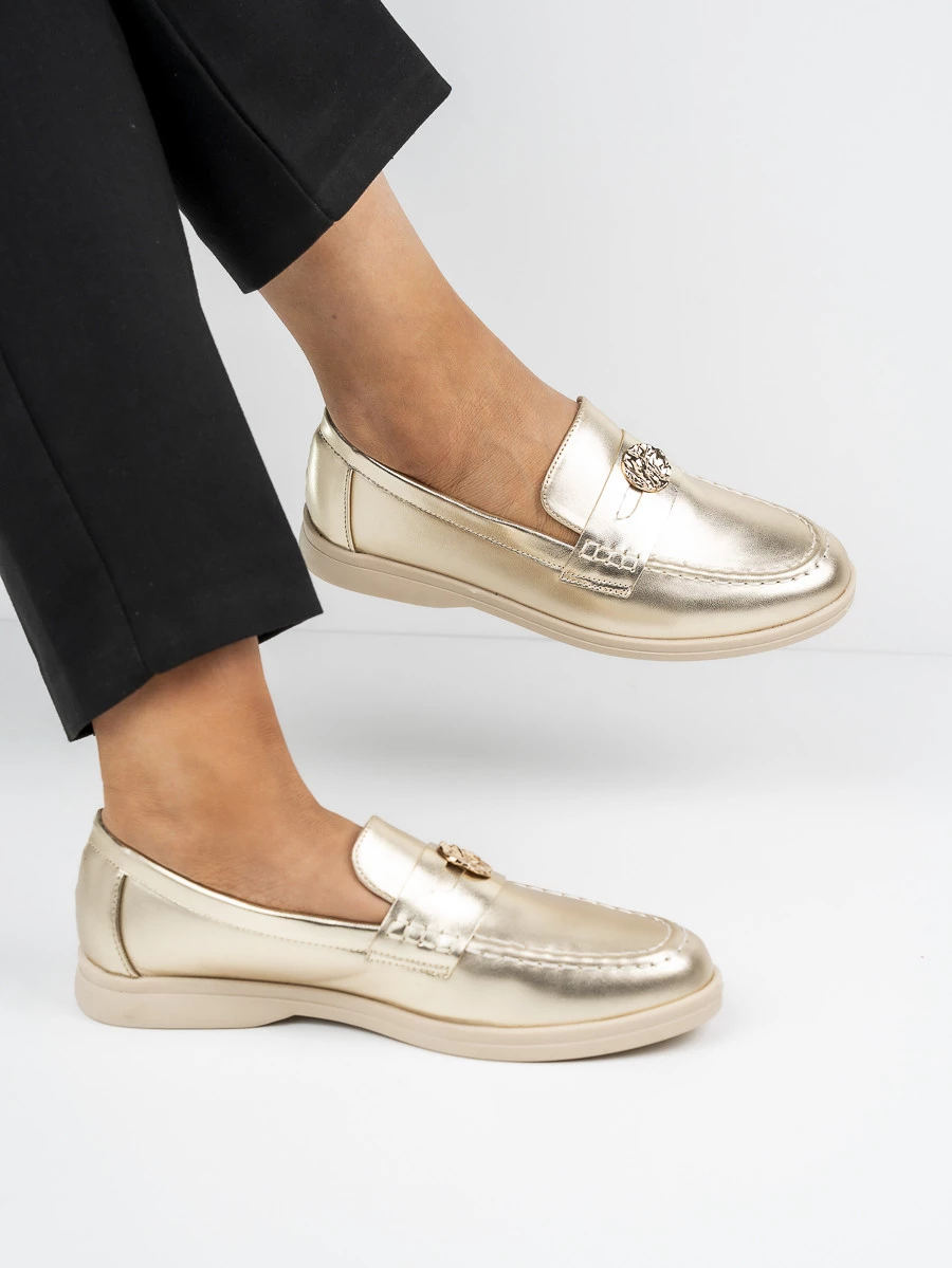 Eleganckie mokasyny w kolorze Gold, doskonałe na co dzień i wyjątkowe okazje. Wyróżniają się stylową złotą ozdobą, która dodaje im klasy i wyjątkowości. Lekkie i wygodne, idealnie dopasowują się do stopy, zapewniając komfort przez cały dzień.